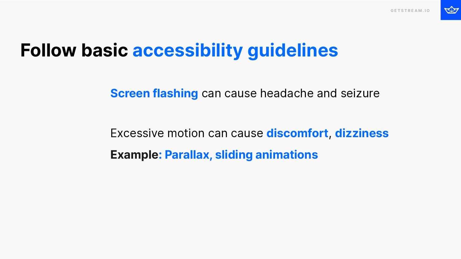 I O Screen flashing can cause headache and seizure Excessive motion can cause discomfort, dizziness Example: Parallax, sliding animations Follow basic accessibility guidelines