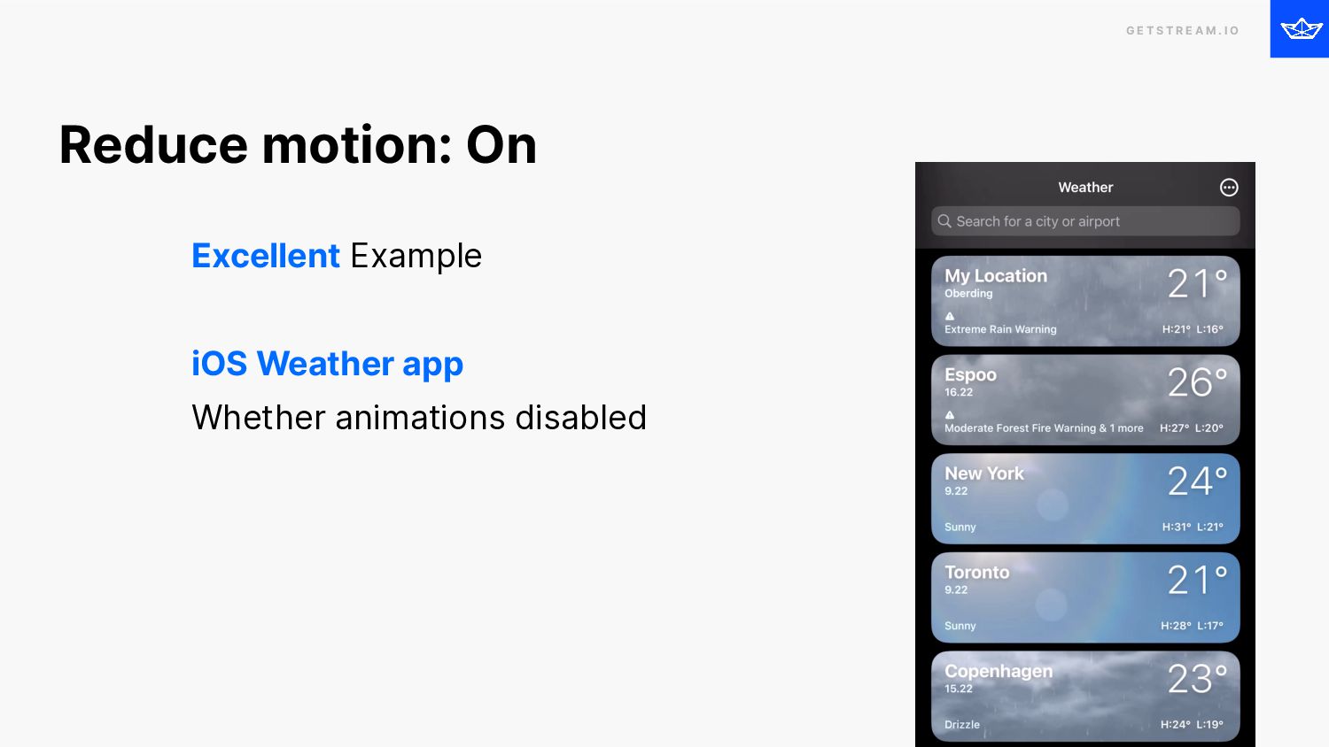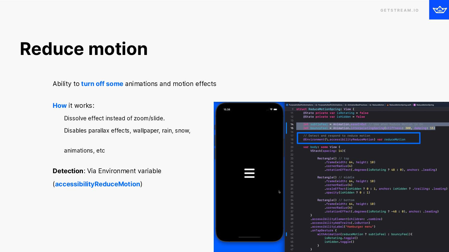 I O Ability to turn off some animations and motion effects How it works: Dissolve effect instead of zoom/slide. Disables parallax effects, wallpaper, rain, snow, animations, etc Detection: Via Environment variable (accessibilityReduceMotion) Reduce motion