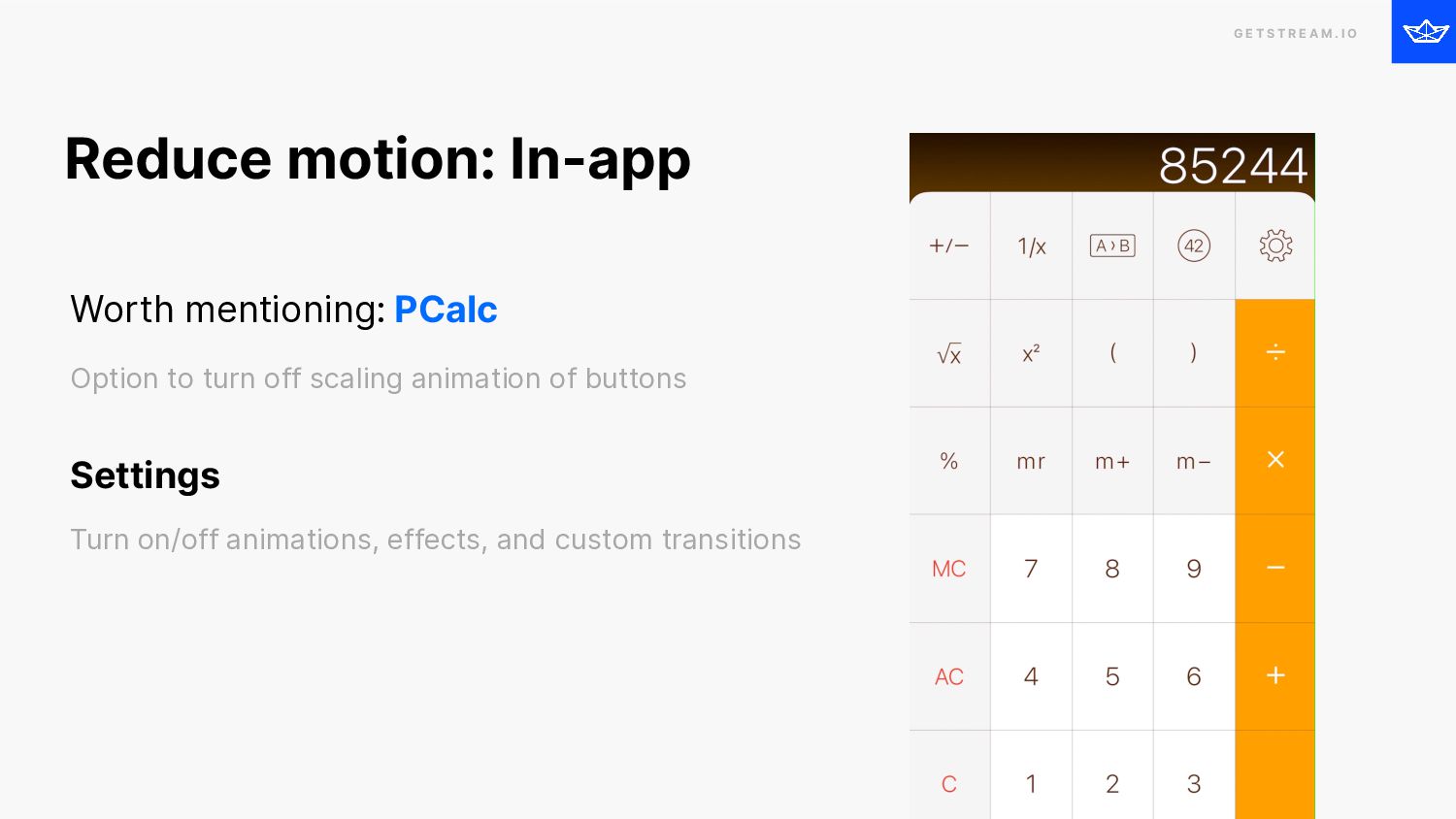 I O Worth mentioning: PCalc Option to turn off scaling animation of buttons Settings Turn on/off animations, effects, and custom transitions Reduce motion: In-app
