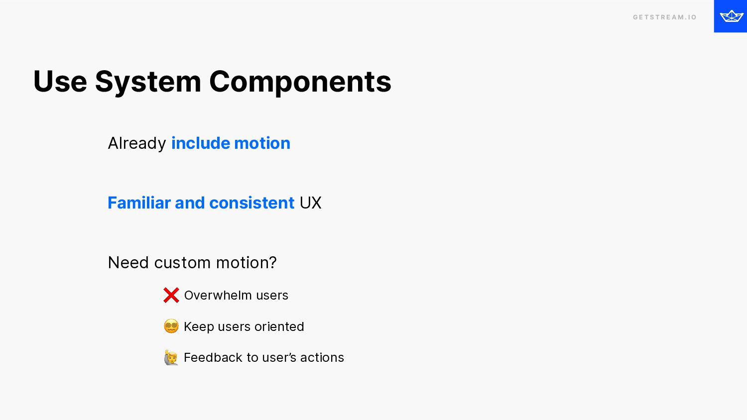 I O Already include motion Familiar and consistent UX Need custom motion? ❌ Overwhelm users 😵💫 Keep users oriented 🙋 Feedback to user’s actions Use System Components