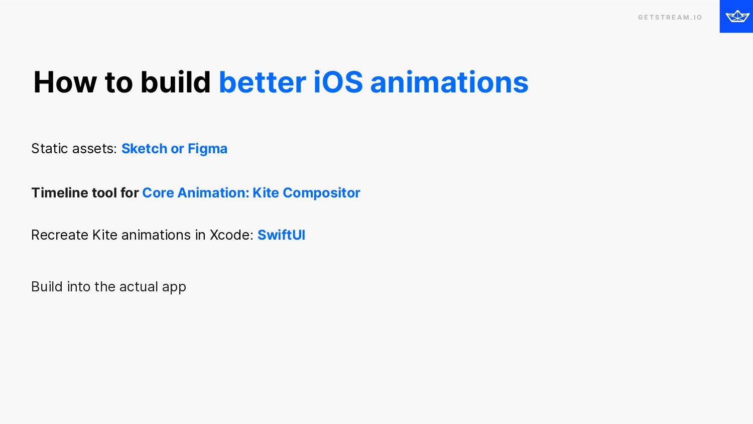 I O Static assets: Sketch or Figma Timeline tool for Core Animation: Kite Compositor Recreate Kite animations in Xcode: SwiftUI Build into the actual app How to build better iOS animations