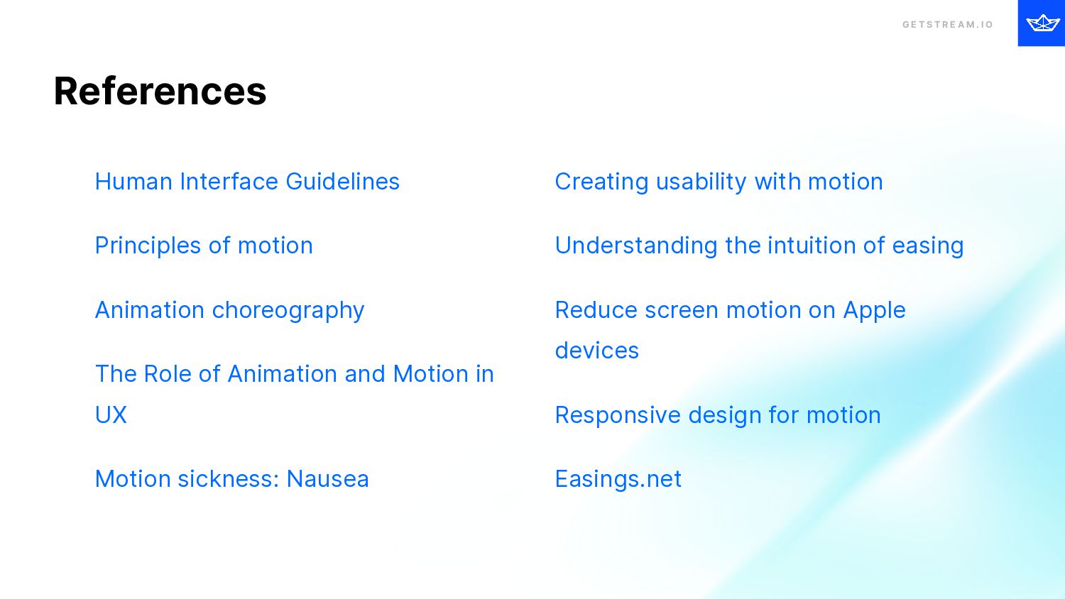 I O References Human Interface Guidelines Principles of motion Animation choreography The Role of Animation and Motion in UX Motion sickness: Nausea Creating usability with motion Understanding the intuition of easing Reduce screen motion on Apple devices Responsive design for motion Easings.net