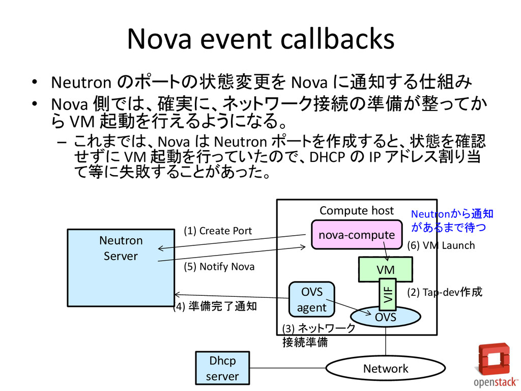 に通知する仕組み • Nova 側では、確実に、ネットワーク接続の準備が整ってか ら VM 起動を行えるようになる。 – これまでは、Nova は Neutron ポートを作成すると、状態を確認 せずに VM 起動を行っていたので、DHCP の IP アドレス割り当 て等に失敗することがあった。 nova-compute VM OVS VIF Neutron Server OVS agent (1) Create Port (2) Tap-dev作成 Network (3) ネットワーク 接続準備 (4) 準備完了通知 (5) Notify Nova (6) VM Launch Dhcp server Neutronから通知 があるまで待つ