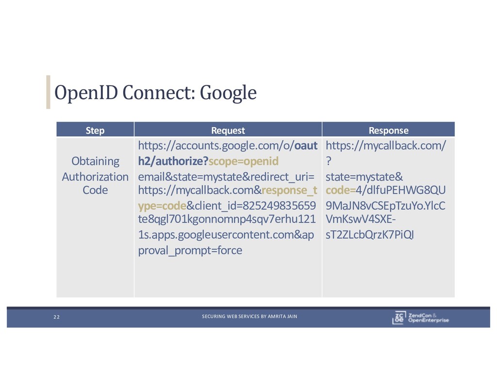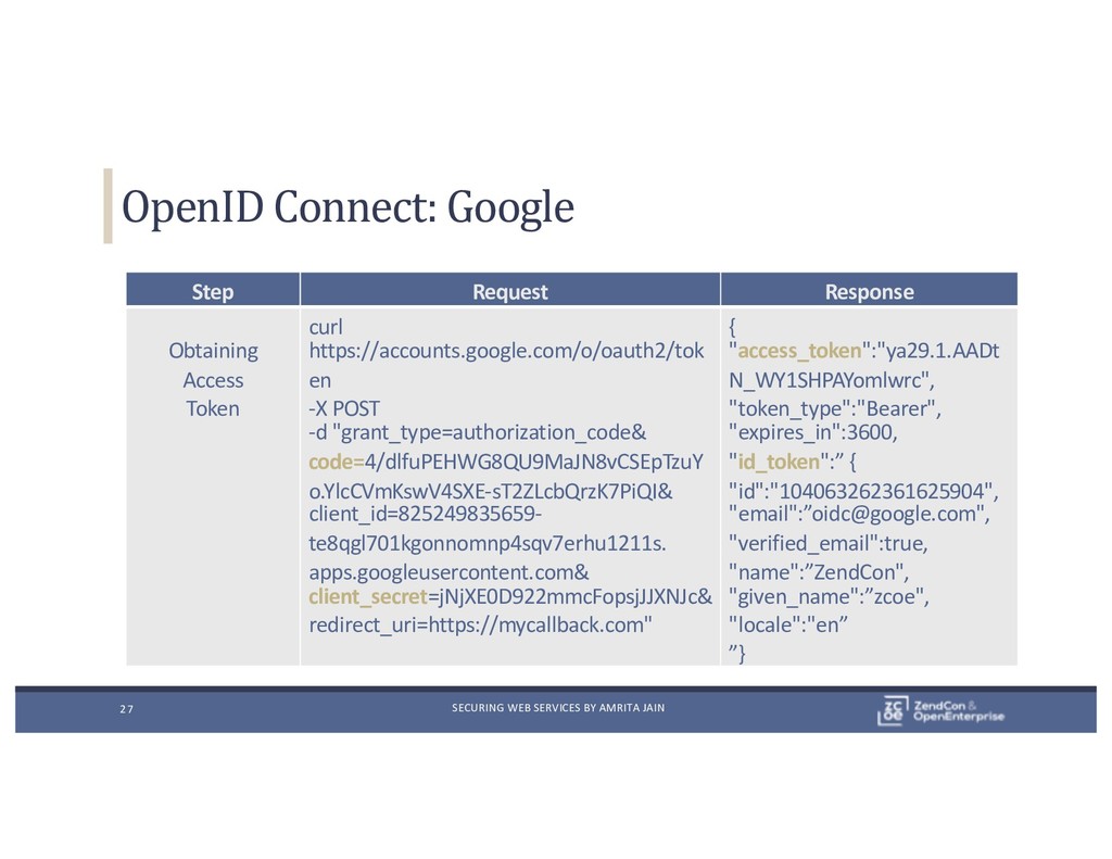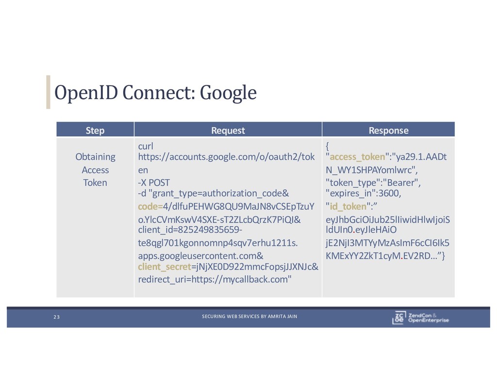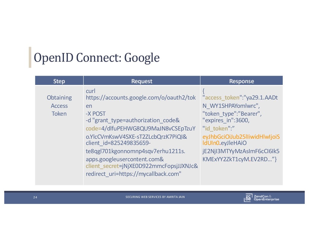 Step Request Response Obtaining Access Token curl https://accounts.google.com/o/oauth2/tok en -X POST -d "grant_type=authorization_code& code=4/dlfuPEHWG8QU9MaJN8vCSEpTzuY o.YlcCVmKswV4SXE-sT2ZLcbQrzK7PiQI& client_id=825249835659- te8qgl701kgonnomnp4sqv7erhu1211s. apps.googleusercontent.com& client_secret=jNjXE0D922mmcFopsjJJXNJc& redirect_uri=https://mycallback.com" { "access_token":"ya29.1.AADt N_WY1SHPAYomlwrc", "token_type":"Bearer", "expires_in":3600, "id_token":” { "id":"104063262361625904", "email":”