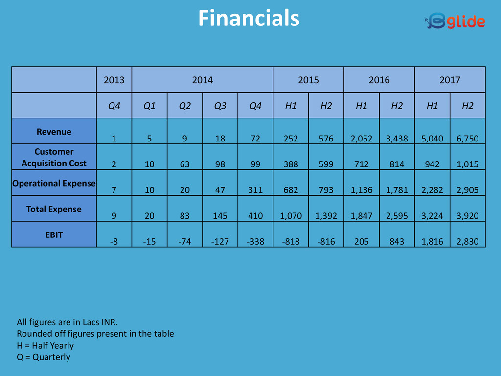 Q4 H1 H2 H1 H2 H1 H2 Revenue 1 5 9 18 72 252 576 2,052 3,438 5,040 6,750 Customer Acquisition Cost 2 10 63 98 99 388 599 712 814 942 1,015 Operational Expense 7 10 20 47 311 682 793 1,136 1,781 2,282 2,905 Total Expense 9 20 83 145 410 1,070 1,392 1,847 2,595 3,224 3,920 EBIT -8 -15 -74 -127 -338 -818 -816 205 843 1,816 2,830 All figures are in Lacs INR. Rounded off figures present in the table H = Half Yearly Q = Quarterly