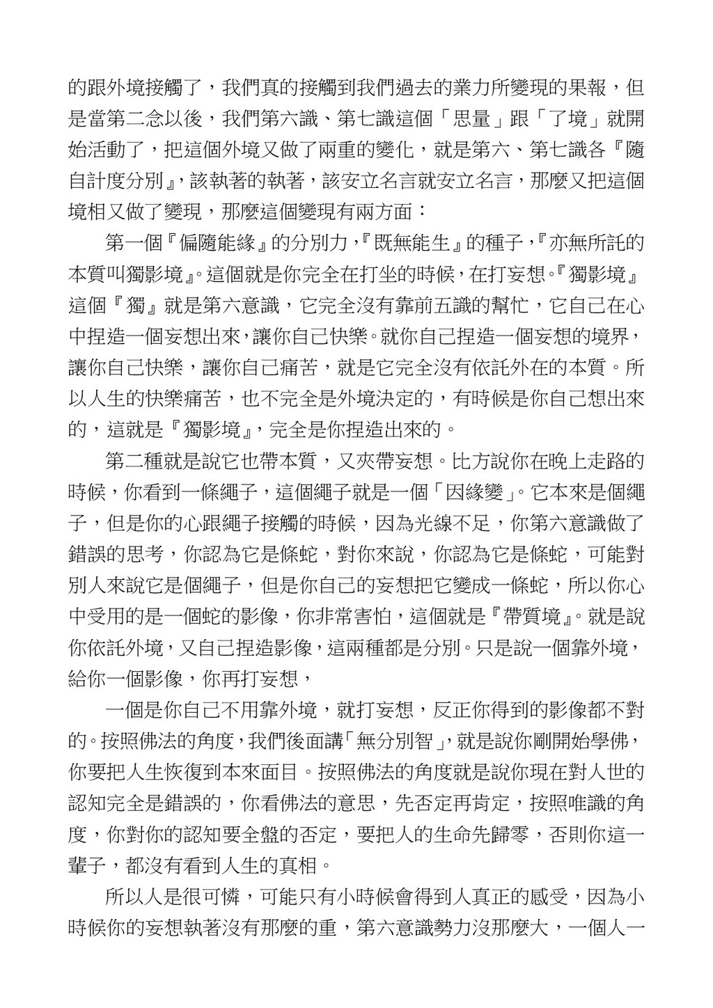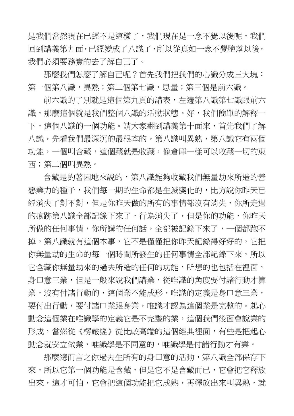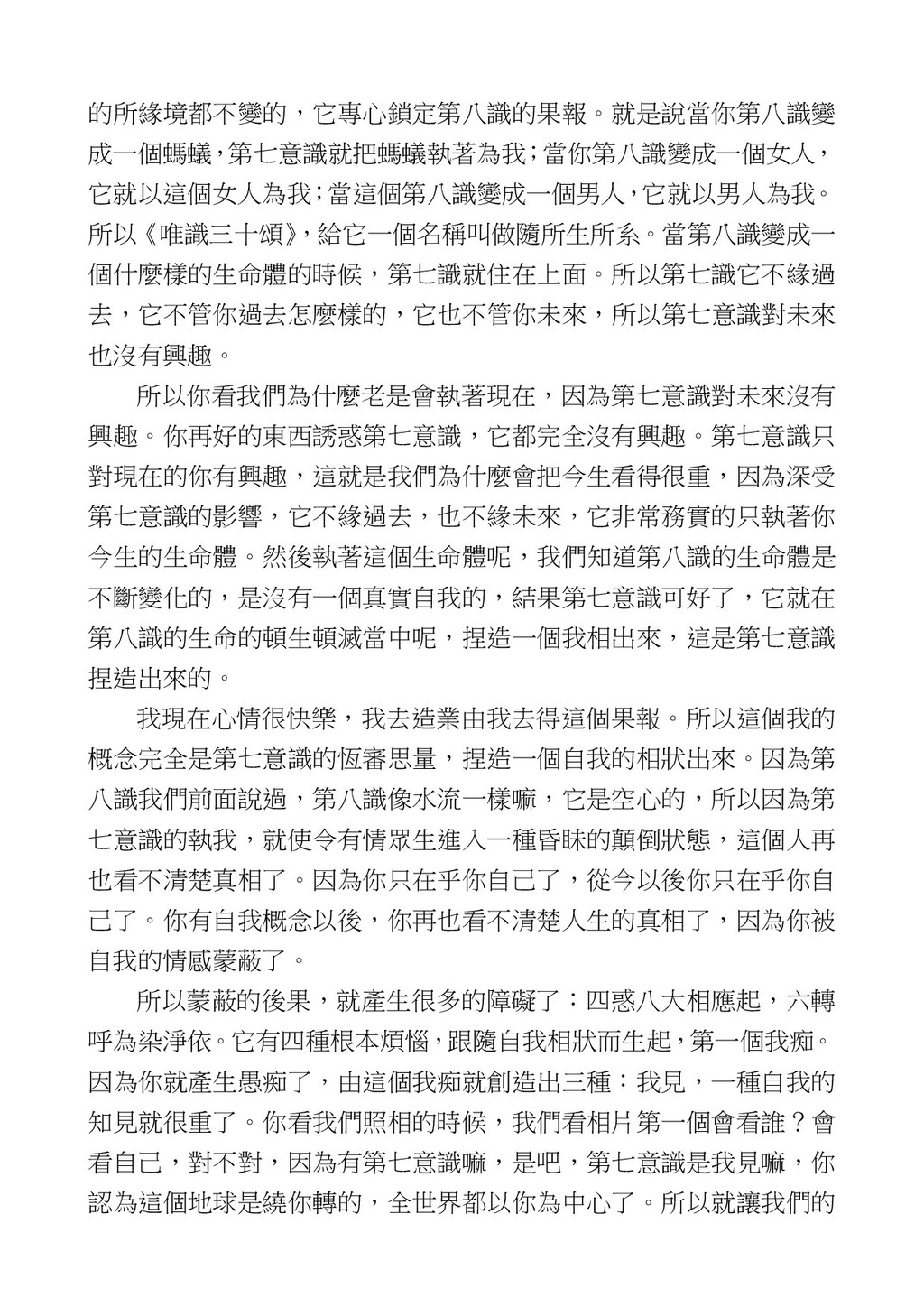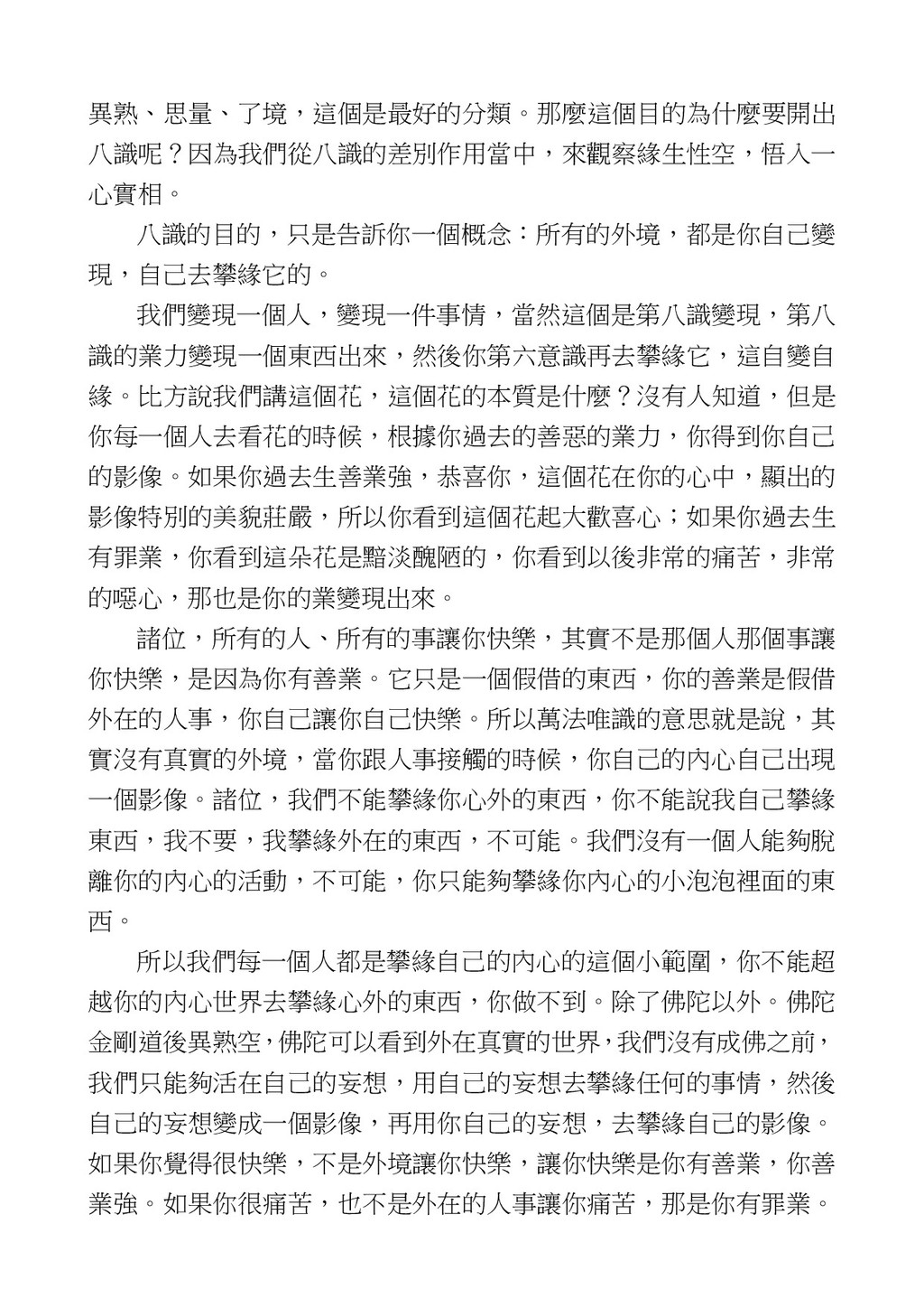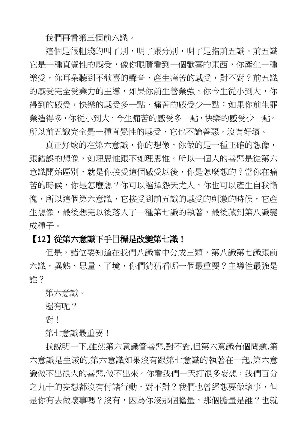 意識開始區別,就是你接受這個感受以後,你是怎麼想的?當你在痛 苦的時候,你是怎麼想?你可以選擇怨天尤人,你也可以產生自我慚 愧,所以這個第六意識,它接受到前五識的感受的刺激的時候,它產 生想像,最後想完以後落入了一種第七識的執著,最後藏到第八識變 成種子。 【12】從第六意識下手目標是改變第七識! 但是,諸位要知道在我們八識當中分成三類,第八識第七識跟前 六識,異熟、思量、了境,你們猜猜看哪一個最重要?主導性最強是 誰? 第六意識。 還有呢? 對! 第七意識最重要! 我說明一下,雖然第六意識管善惡,對不對,但第六意識有個問題,第 六意識是生滅的,第六意識如果沒有跟第七意識的執著在一起,第六意 識做不出很大的善惡,做不出來。你看我們一天打很多妄想,我們百分 之九十的妄想都沒有付諸行動,對不對?我們也曾經想要做壞事,但 是你有去做壞事嗎?沒有,因為你沒那個膽量,那個膽量是誰?也就