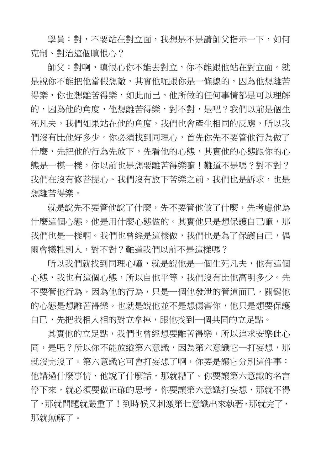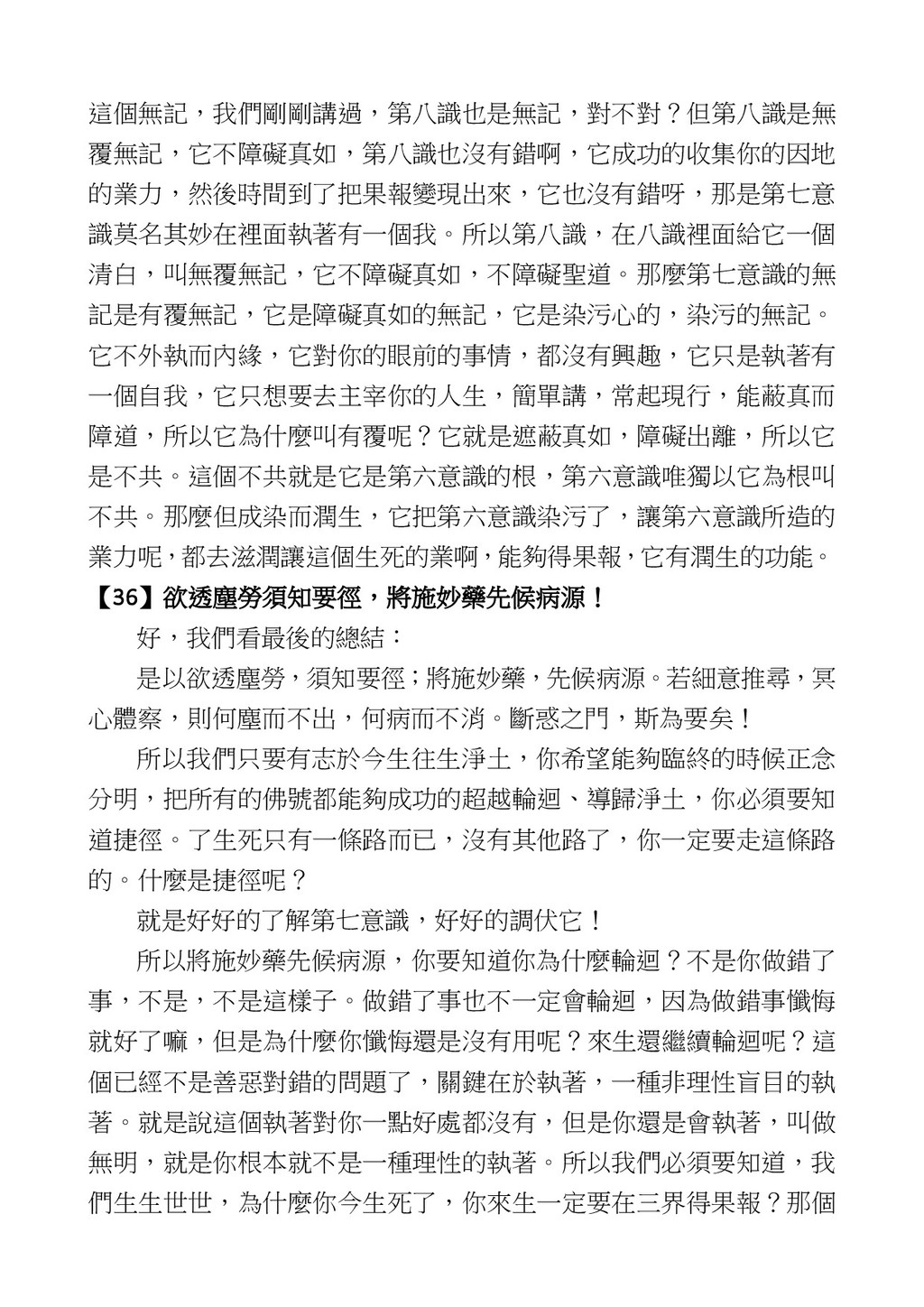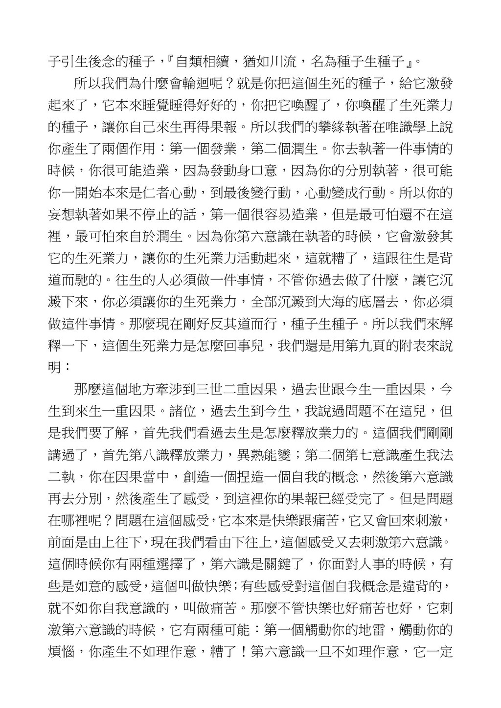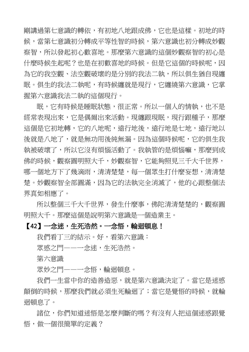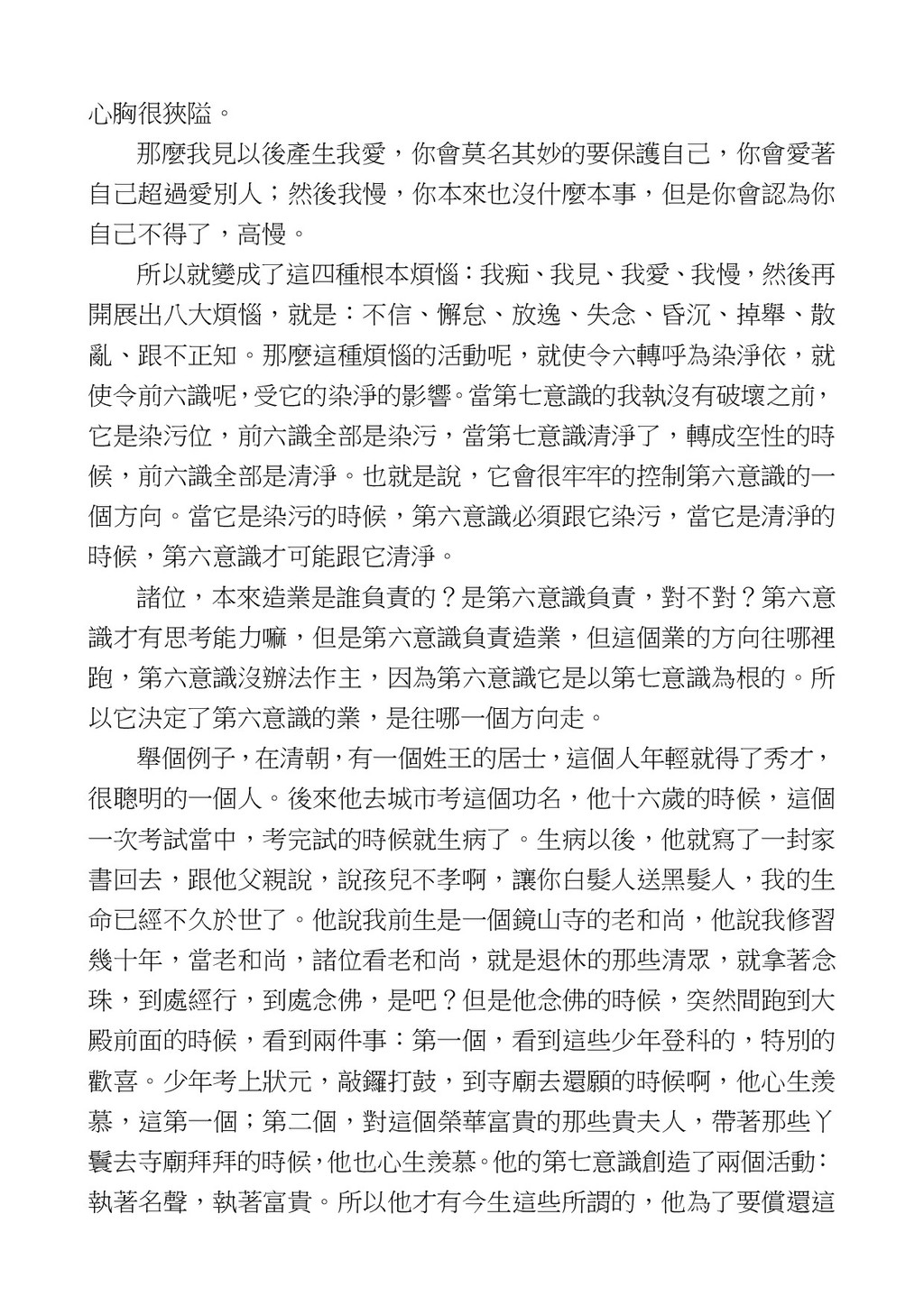 意識開始區別,就是你接受這個感受以後,你是怎麼想的?當你在痛 苦的時候,你是怎麼想?你可以選擇怨天尤人,你也可以產生自我慚 愧,所以這個第六意識,它接受到前五識的感受的刺激的時候,它產 生想像,最後想完以後落入了一種第七識的執著,最後藏到第八識變 成種子。 【12】從第六意識下手目標是改變第七識! 但是,諸位要知道在我們八識當中分成三類,第八識第七識跟前 六識,異熟、思量、了境,你們猜猜看哪一個最重要?主導性最強是 誰? 第六意識。 還有呢? 對! 第七意識最重要! 我說明一下,雖然第六意識管善惡,對不對,但第六意識有個問題,第 六意識是生滅的,第六意識如果沒有跟第七意識的執著在一起,第六意 識做不出很大的善惡,做不出來。你看我們一天打很多妄想,我們百分 之九十的妄想都沒有付諸行動,對不對?我們也曾經想要做壞事,但 是你有去做壞事嗎?沒有,因為你沒那個膽量,那個膽量是誰?也就