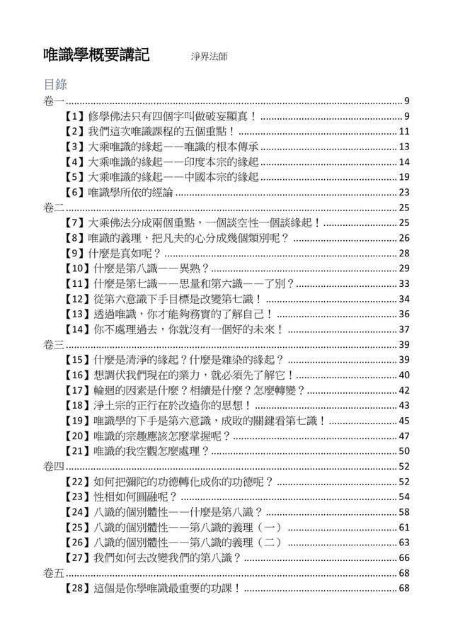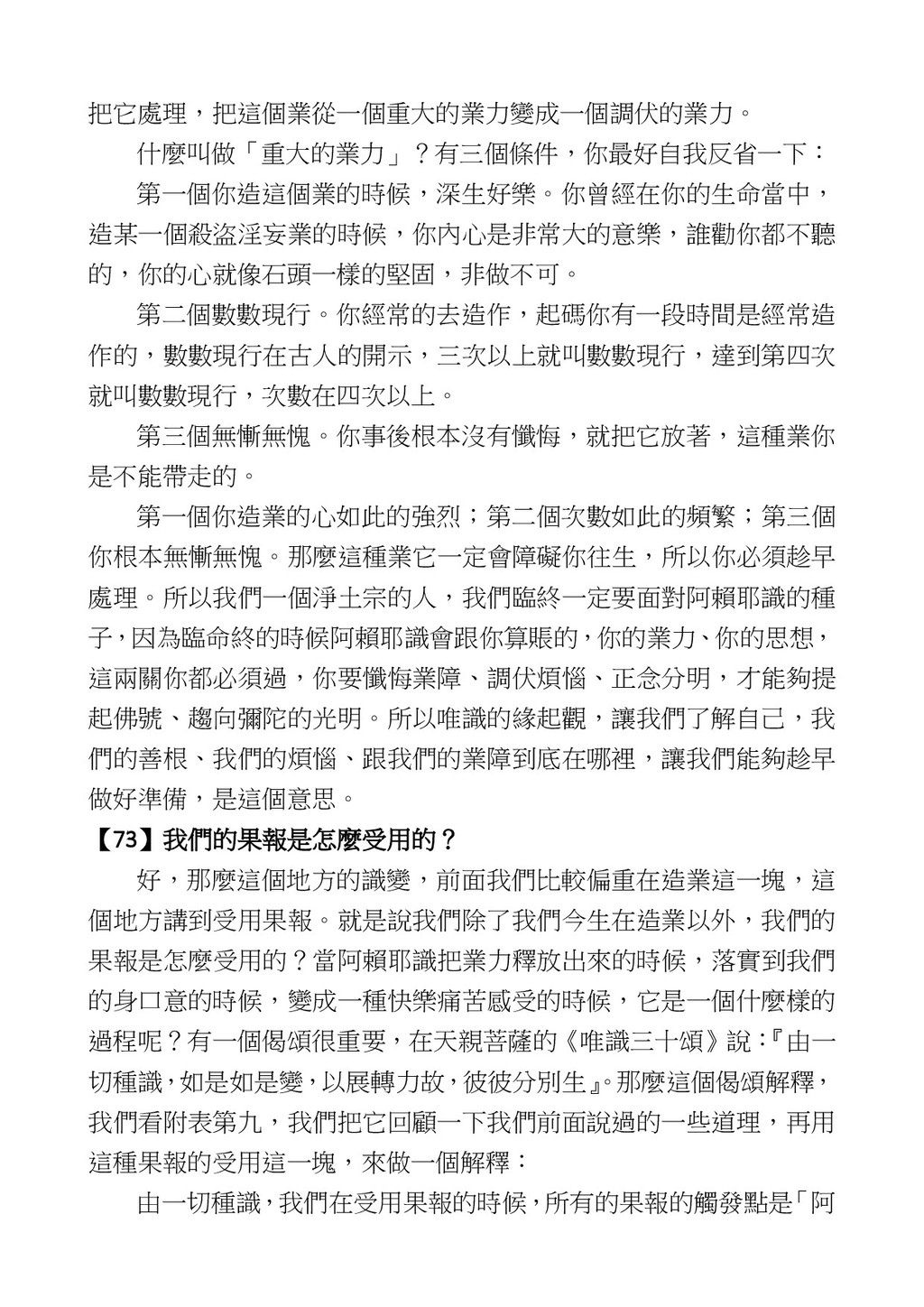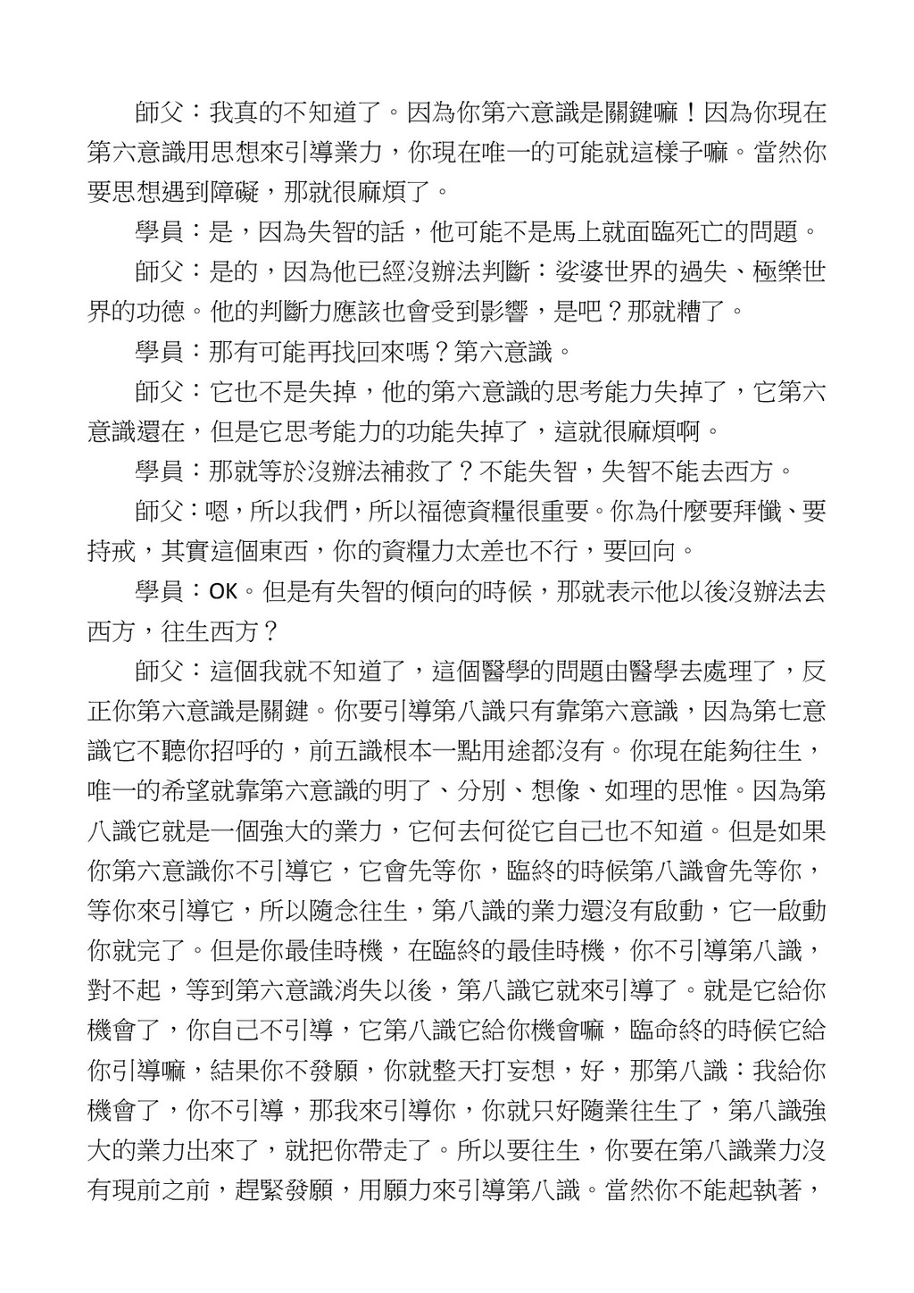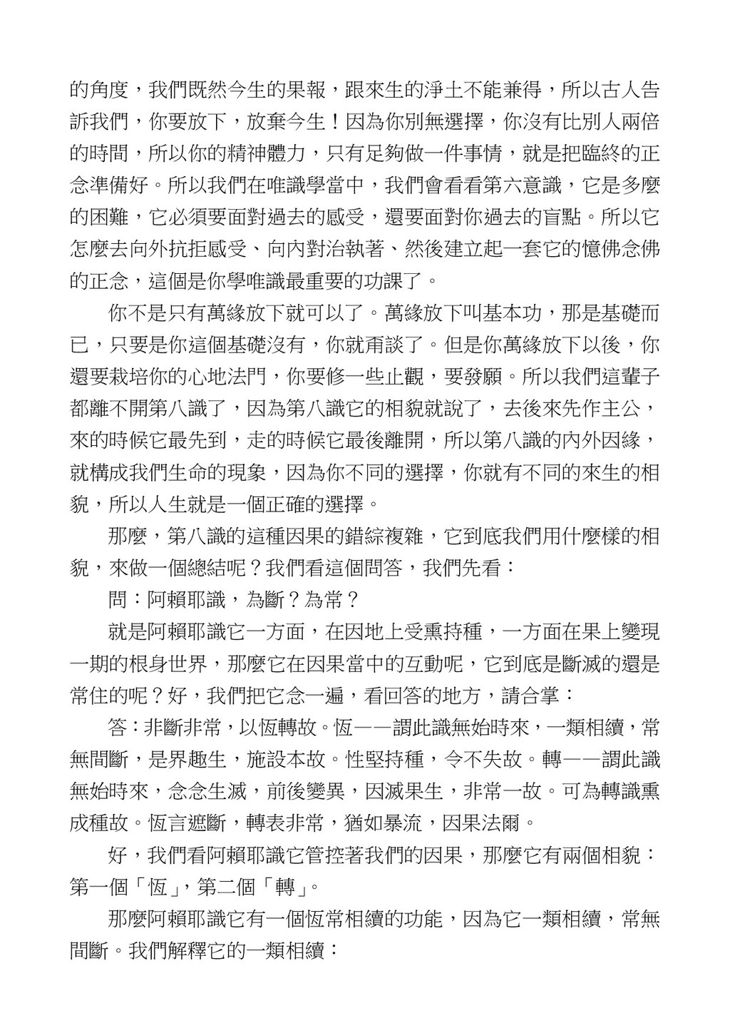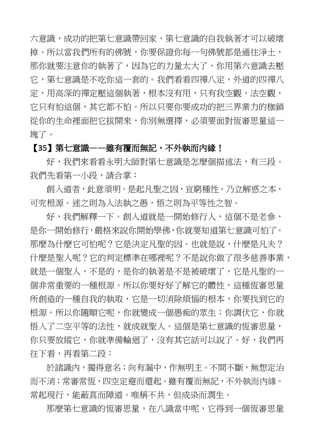意識開始區別,就是你接受這個感受以後,你是怎麼想的?當你在痛 苦的時候,你是怎麼想?你可以選擇怨天尤人,你也可以產生自我慚 愧,所以這個第六意識,它接受到前五識的感受的刺激的時候,它產 生想像,最後想完以後落入了一種第七識的執著,最後藏到第八識變 成種子。 【12】從第六意識下手目標是改變第七識! 但是,諸位要知道在我們八識當中分成三類,第八識第七識跟前 六識,異熟、思量、了境,你們猜猜看哪一個最重要?主導性最強是 誰? 第六意識。 還有呢? 對! 第七意識最重要! 我說明一下,雖然第六意識管善惡,對不對,但第六意識有個問題,第 六意識是生滅的,第六意識如果沒有跟第七意識的執著在一起,第六意 識做不出很大的善惡,做不出來。你看我們一天打很多妄想,我們百分 之九十的妄想都沒有付諸行動,對不對?我們也曾經想要做壞事,但 是你有去做壞事嗎?沒有,因為你沒那個膽量,那個膽量是誰?也就