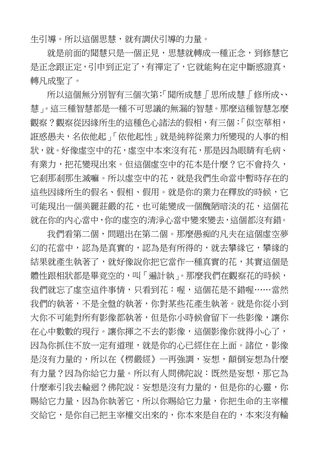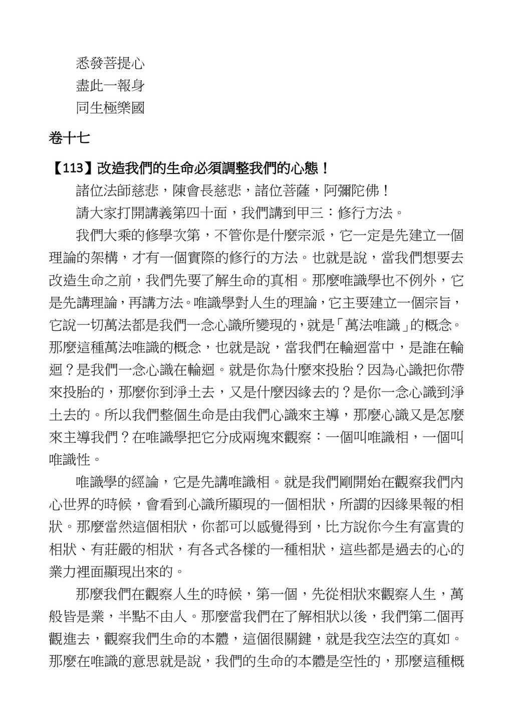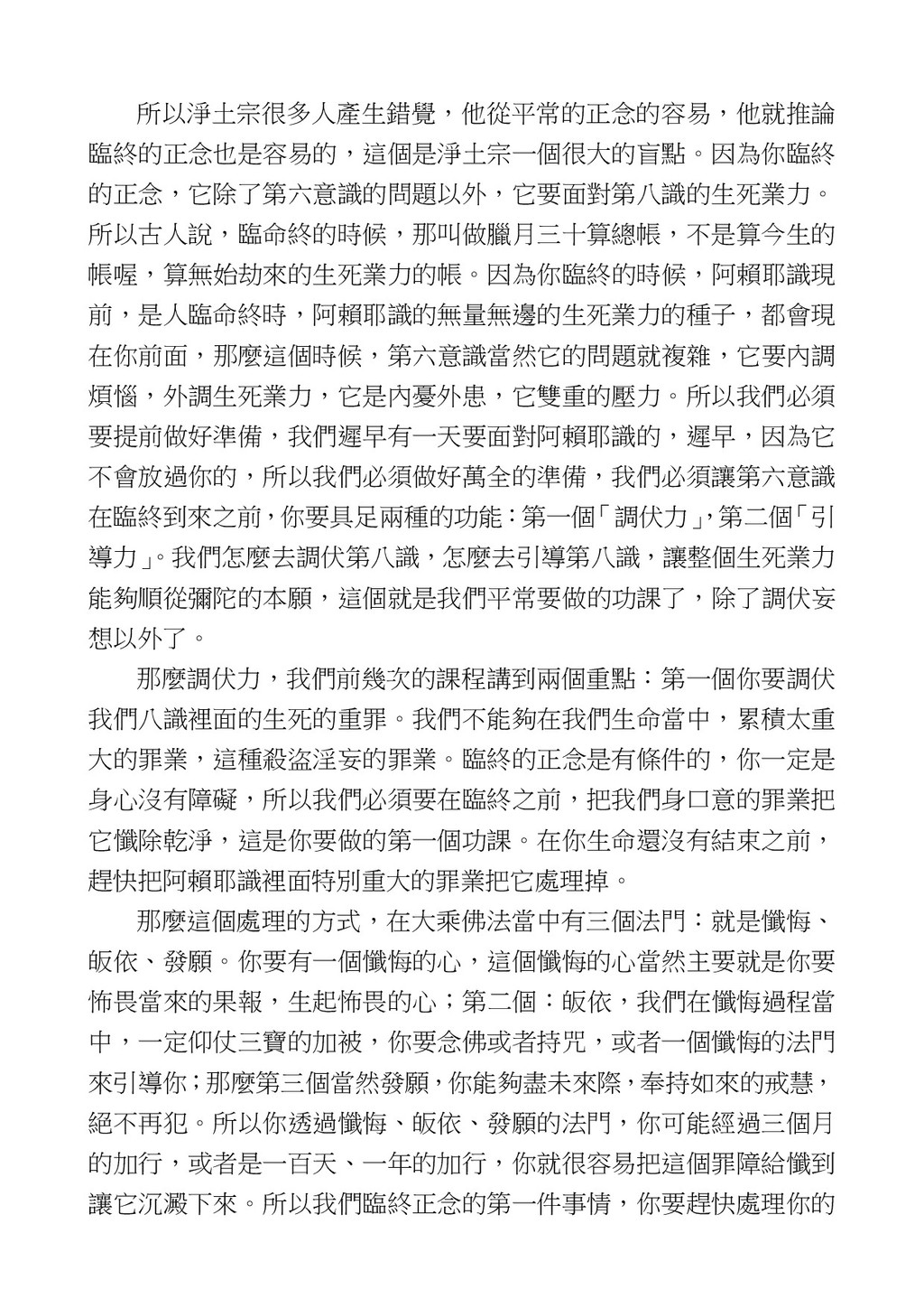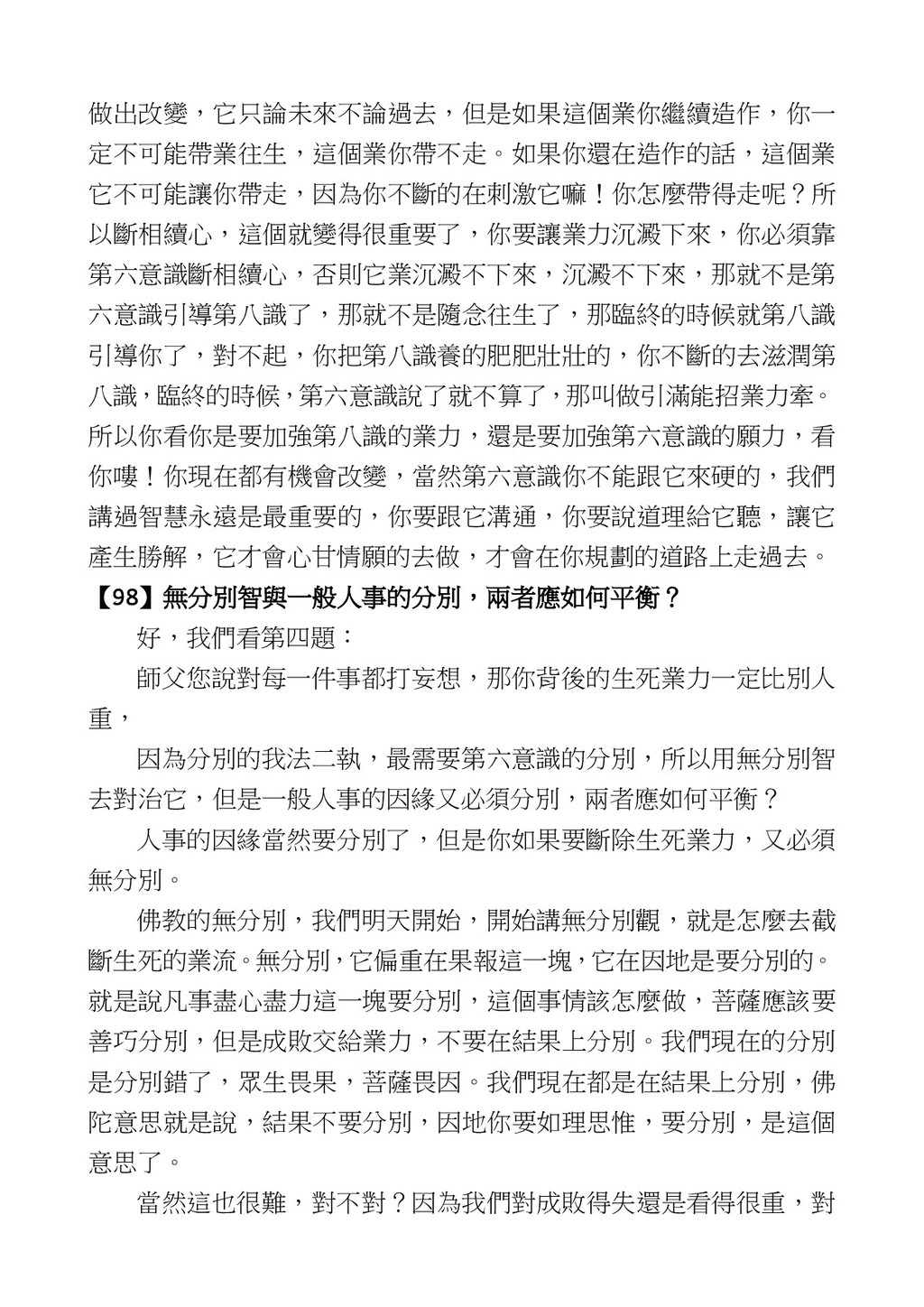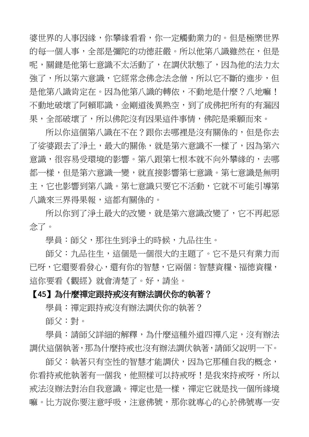 意識開始區別,就是你接受這個感受以後,你是怎麼想的?當你在痛 苦的時候,你是怎麼想?你可以選擇怨天尤人,你也可以產生自我慚 愧,所以這個第六意識,它接受到前五識的感受的刺激的時候,它產 生想像,最後想完以後落入了一種第七識的執著,最後藏到第八識變 成種子。 【12】從第六意識下手目標是改變第七識! 但是,諸位要知道在我們八識當中分成三類,第八識第七識跟前 六識,異熟、思量、了境,你們猜猜看哪一個最重要?主導性最強是 誰? 第六意識。 還有呢? 對! 第七意識最重要! 我說明一下,雖然第六意識管善惡,對不對,但第六意識有個問題,第 六意識是生滅的,第六意識如果沒有跟第七意識的執著在一起,第六意 識做不出很大的善惡,做不出來。你看我們一天打很多妄想,我們百分 之九十的妄想都沒有付諸行動,對不對?我們也曾經想要做壞事,但 是你有去做壞事嗎?沒有,因為你沒那個膽量,那個膽量是誰?也就