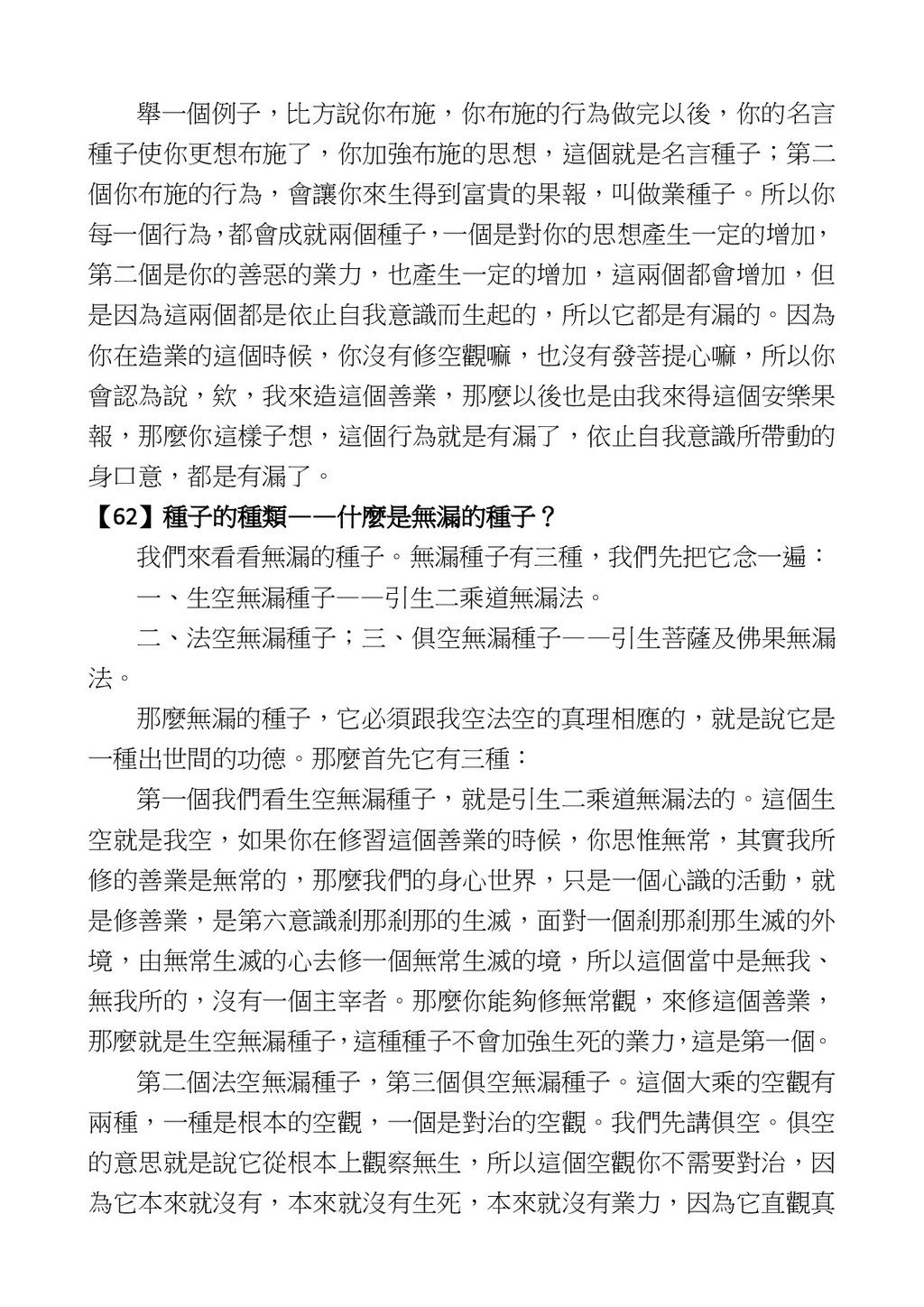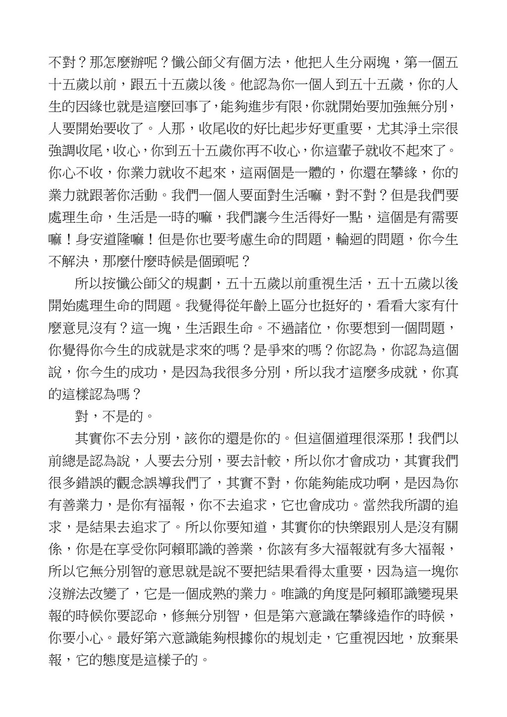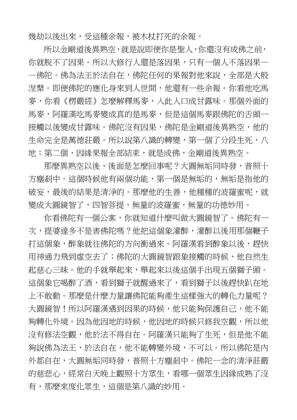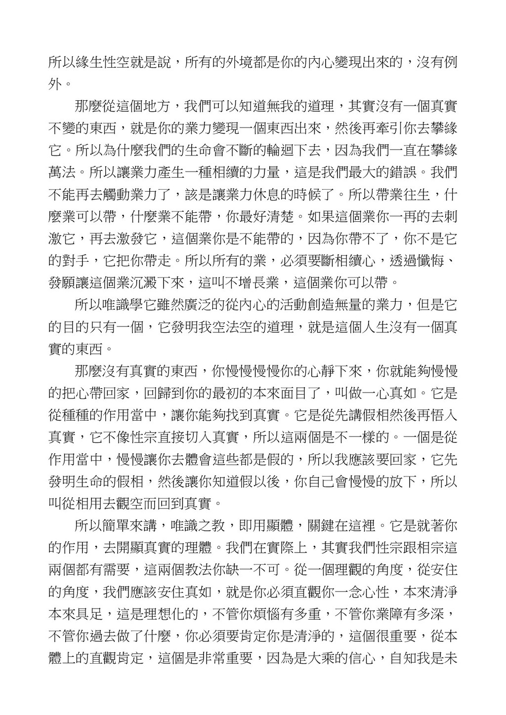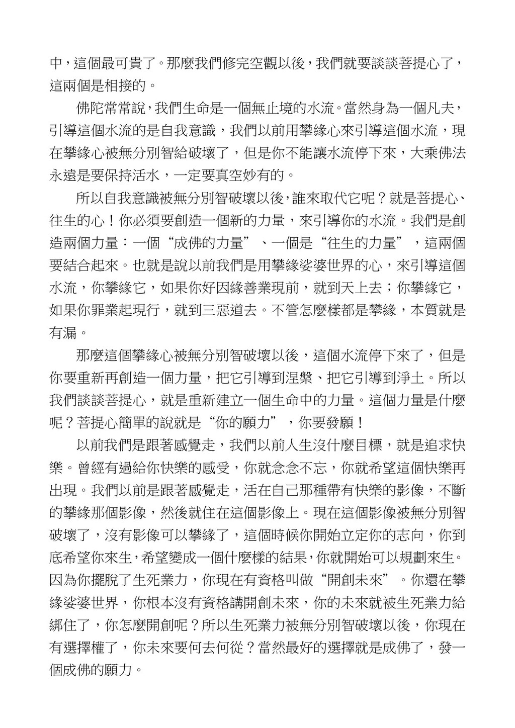 意識開始區別,就是你接受這個感受以後,你是怎麼想的?當你在痛 苦的時候,你是怎麼想?你可以選擇怨天尤人,你也可以產生自我慚 愧,所以這個第六意識,它接受到前五識的感受的刺激的時候,它產 生想像,最後想完以後落入了一種第七識的執著,最後藏到第八識變 成種子。 【12】從第六意識下手目標是改變第七識! 但是,諸位要知道在我們八識當中分成三類,第八識第七識跟前 六識,異熟、思量、了境,你們猜猜看哪一個最重要?主導性最強是 誰? 第六意識。 還有呢? 對! 第七意識最重要! 我說明一下,雖然第六意識管善惡,對不對,但第六意識有個問題,第 六意識是生滅的,第六意識如果沒有跟第七意識的執著在一起,第六意 識做不出很大的善惡,做不出來。你看我們一天打很多妄想,我們百分 之九十的妄想都沒有付諸行動,對不對?我們也曾經想要做壞事,但 是你有去做壞事嗎?沒有,因為你沒那個膽量,那個膽量是誰?也就