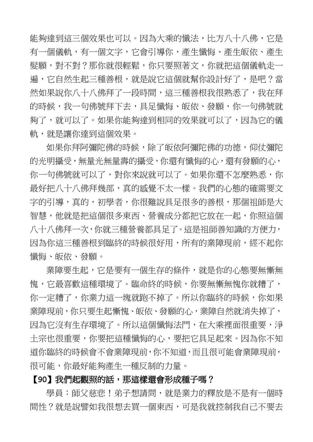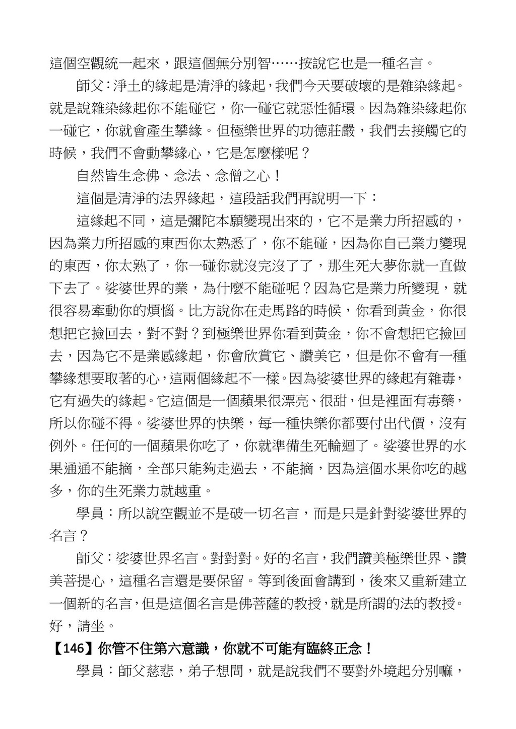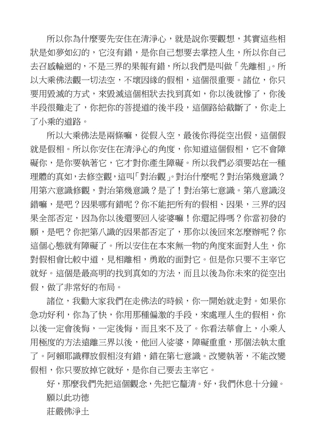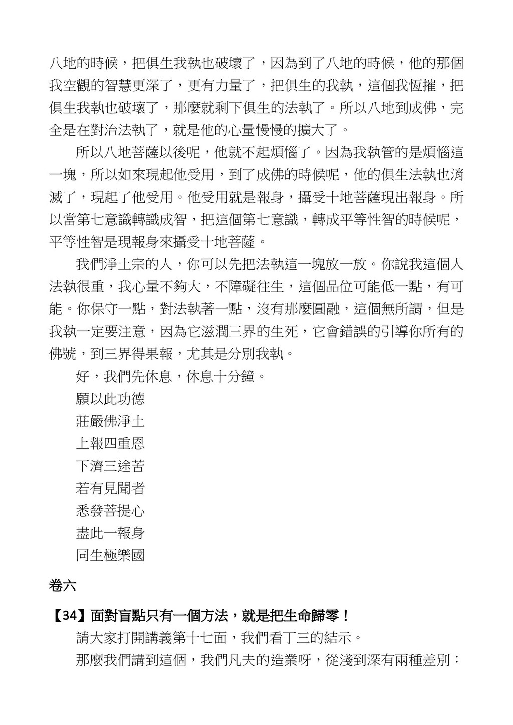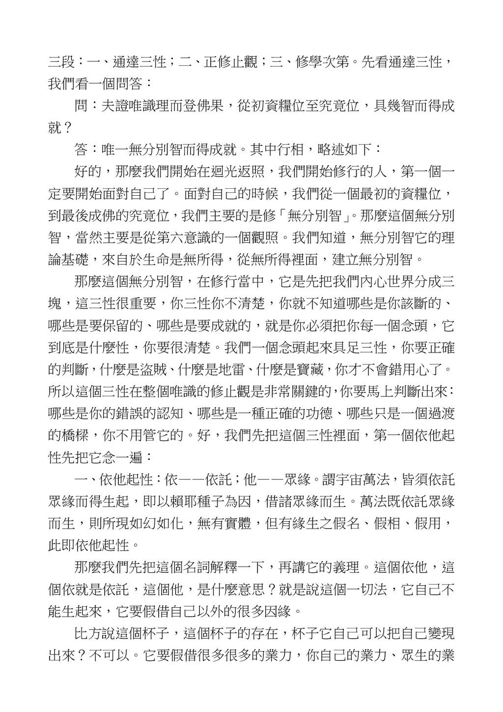 意識開始區別,就是你接受這個感受以後,你是怎麼想的?當你在痛 苦的時候,你是怎麼想?你可以選擇怨天尤人,你也可以產生自我慚 愧,所以這個第六意識,它接受到前五識的感受的刺激的時候,它產 生想像,最後想完以後落入了一種第七識的執著,最後藏到第八識變 成種子。 【12】從第六意識下手目標是改變第七識! 但是,諸位要知道在我們八識當中分成三類,第八識第七識跟前 六識,異熟、思量、了境,你們猜猜看哪一個最重要?主導性最強是 誰? 第六意識。 還有呢? 對! 第七意識最重要! 我說明一下,雖然第六意識管善惡,對不對,但第六意識有個問題,第 六意識是生滅的,第六意識如果沒有跟第七意識的執著在一起,第六意 識做不出很大的善惡,做不出來。你看我們一天打很多妄想,我們百分 之九十的妄想都沒有付諸行動,對不對?我們也曾經想要做壞事,但 是你有去做壞事嗎?沒有,因為你沒那個膽量,那個膽量是誰?也就