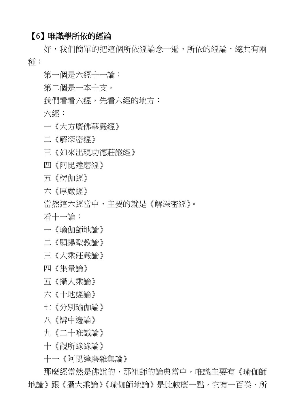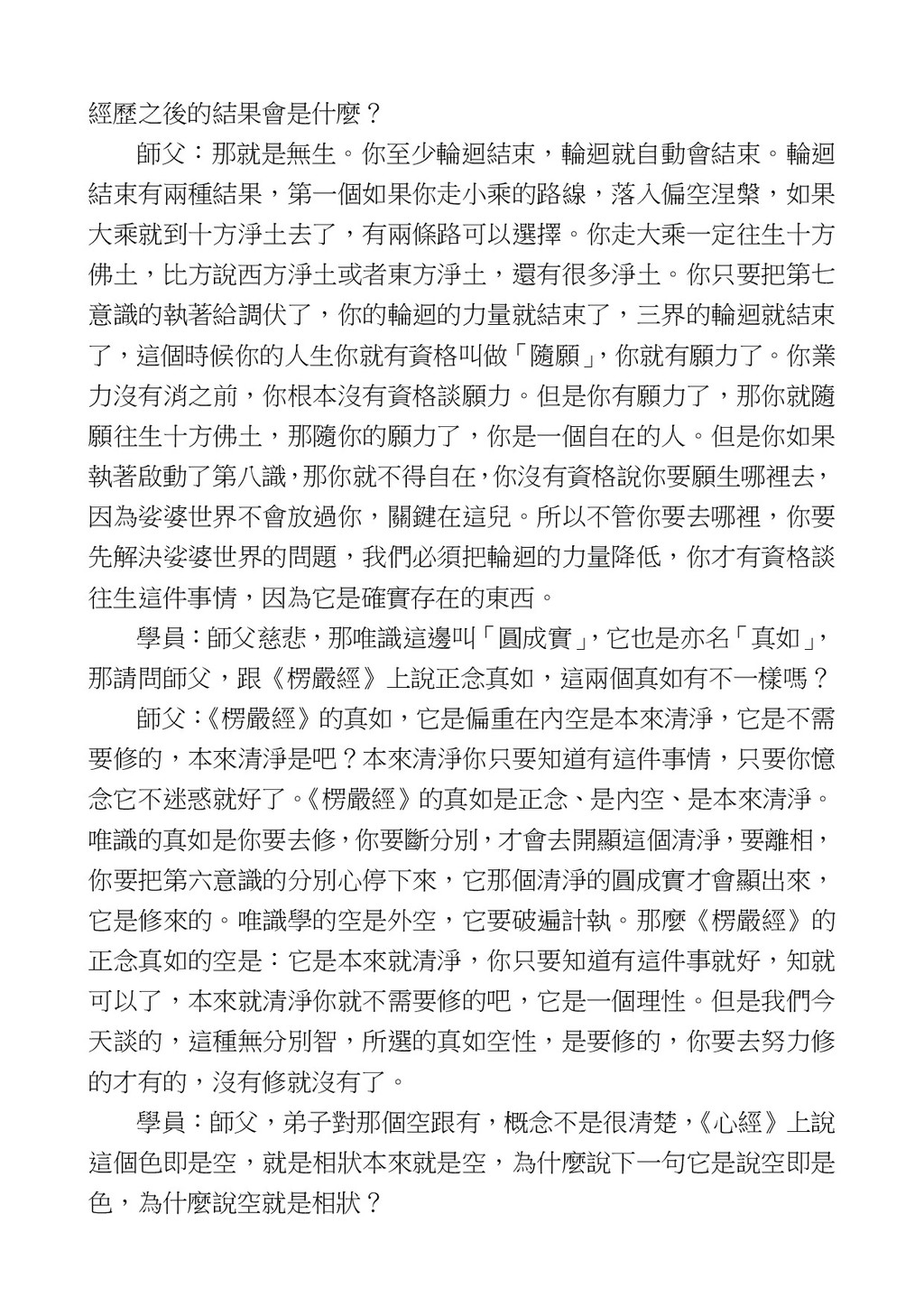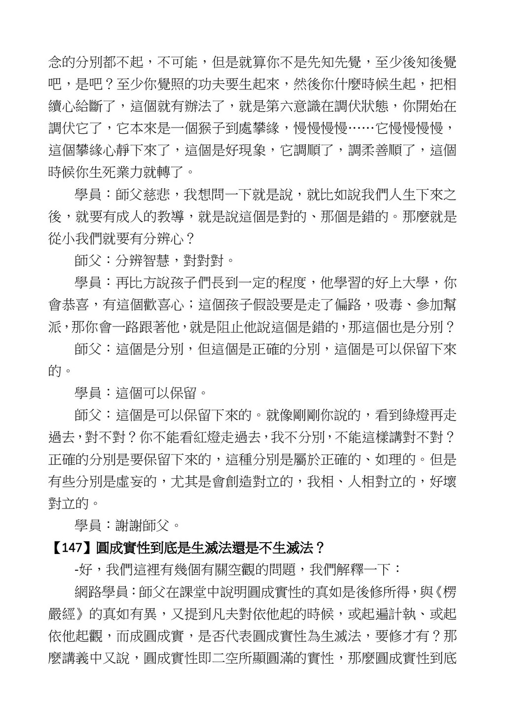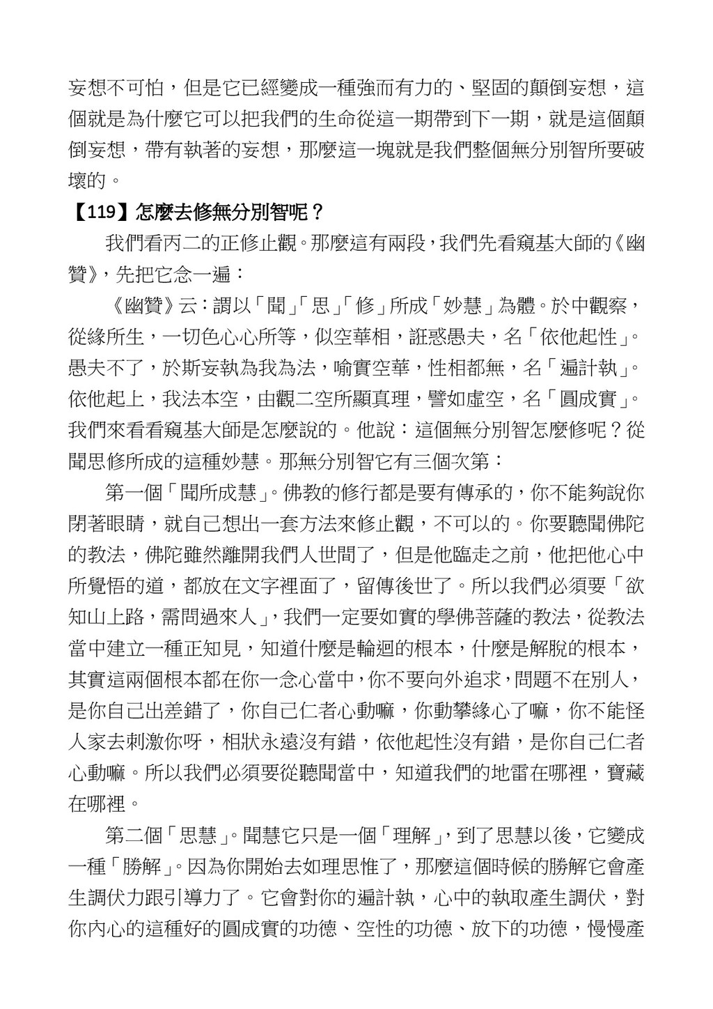 意識開始區別,就是你接受這個感受以後,你是怎麼想的?當你在痛 苦的時候,你是怎麼想?你可以選擇怨天尤人,你也可以產生自我慚 愧,所以這個第六意識,它接受到前五識的感受的刺激的時候,它產 生想像,最後想完以後落入了一種第七識的執著,最後藏到第八識變 成種子。 【12】從第六意識下手目標是改變第七識! 但是,諸位要知道在我們八識當中分成三類,第八識第七識跟前 六識,異熟、思量、了境,你們猜猜看哪一個最重要?主導性最強是 誰? 第六意識。 還有呢? 對! 第七意識最重要! 我說明一下,雖然第六意識管善惡,對不對,但第六意識有個問題,第 六意識是生滅的,第六意識如果沒有跟第七意識的執著在一起,第六意 識做不出很大的善惡,做不出來。你看我們一天打很多妄想,我們百分 之九十的妄想都沒有付諸行動,對不對?我們也曾經想要做壞事,但 是你有去做壞事嗎?沒有,因為你沒那個膽量,那個膽量是誰?也就