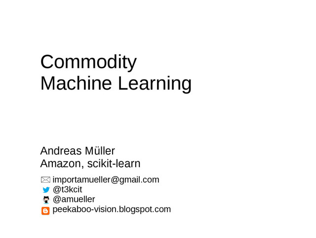 tutorial speaker, presenting right before you, saying he's ill and won't be able to make it. I know you have already committed yourself to two presentations, but is there anyway you could increase your tutorial time slot, maybe just offer time to try out what you've taught? Otherwise I have to do some kind of modern dance interpretation of Python in data :-) -Leah Hi Andreas, I am very interested in your Machine Learning background. I work for X Recruiting who have been engaged by Z, a worldwide leading supplier of Y. We are expanding the core engineering team and we are looking for really passionate engineers who want to create their own story and help millions of people. Can we find a time for a call to chat for a few minutes about this? Thanks Classification