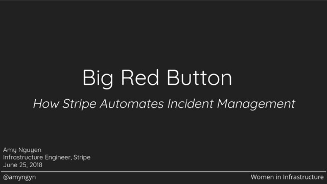 When an incident starts, ten different things need to happen at once. You need to get an incident commander, you need to get all the right people in the room, you need to mitigate the incident, and you need to stay organized. At Stripe, we've built a tool for automating as much of the routine tasks as possible so responders can focus on what humans do best. In this talk, I'll show you the Big Red Button, a web form that sends emails, creates JIRA tickets, opens Slack channels, sends pages, and more. We'll talk about the unique constraints of this tool (such as, how much incident metadata do you ask for up-front?) and how our incident management philosophy influenced our design.