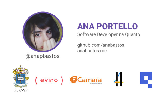 @anapbastos ANA PORTELLO github.com/anabastos anabastos.me Software Developer na Quanto