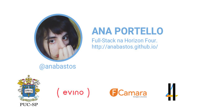 @anabastos ANA PORTELLO http://anabastos.github.io/ Full-Stack na Horizon Four.