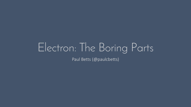 tell you how to write your Electron app, or how Electron itself works • Lots and lots of great talks about this, I recommend Jessica Lord’s Essential Electron (http://jlord.us/essential-electron) to learn more