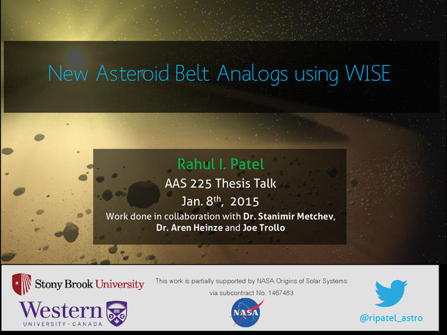 225 Thesis Talk Jan. 8th, 2015 Work done in collaboration with Dr. Stanimir Metchev, Dr. Aren Heinze and Joe Trollo This work is partially supported by NASA Origins of Solar Systems via subcontract No. 1467483 @ripatel_astro