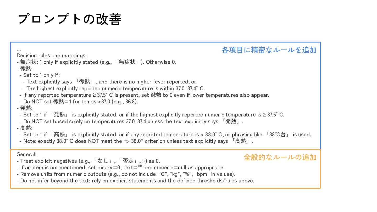 if explicitly stated (e.g., 「無症状」). Otherwise 0. - 微熱: - Set to 1 only if: - Text explicitly says 「微熱」, and there is no higher fever reported; or - The highest explicitly reported numeric temperature is within 37.0–37.4°C. - If any reported temperature ≥ 37.5°C is present, set 微熱 to 0 even if lower temperatures also appear. - Do NOT set 微熱=1 for temps <37.0 (e.g., 36.8). - 発熱: - Set to 1 if 「発熱」 is explicitly stated, or if the highest explicitly reported numeric temperature is ≥ 37.5°C. - Do NOT set based solely on temperatures 37.0–37.4 unless the text explicitly says 「発熱」. - 高熱: - Set to 1 if 「高熱」 is explicitly stated, or if any reported temperature is > 38.0°C, or phrasing like 「38℃台」 is used. - Note: exactly 38.0°C does NOT meet the “> 38.0” criterion unless text explicitly says 「高熱」. … General: - Treat explicit negatives (e.g., 「なし」, 「否定」, ⊖) as 0. - If an item is not mentioned, set binary=0, text="" and numeric=null as appropriate. - Remove units from numeric outputs (e.g., do not include "℃", "kg", "%", "bpm" in values). - Do not infer beyond the text; rely on explicit statements and the defined thresholds/rules above. 各項目に精密なルールを追加 全般的なルールの追加