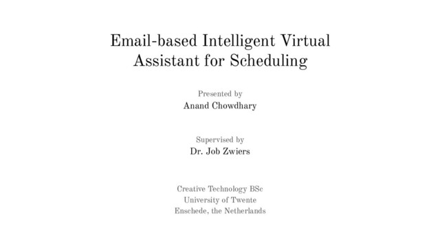 he also co-founded Oswald Labs, an accessibility technology startup, for which he was featured in Forbes and Het Financieele Dagblad lists. He also studied at Santa Clara University as part of the Global Engineering Exchange program, and Bachelor Honors in Science at the UT. Email-based Intelligent Virtual Assistant for Scheduling Presented by Anand Chowdhary Supervised by Dr. Job Zwiers Creative Technology BSc University of Twente Enschede, the Netherlands