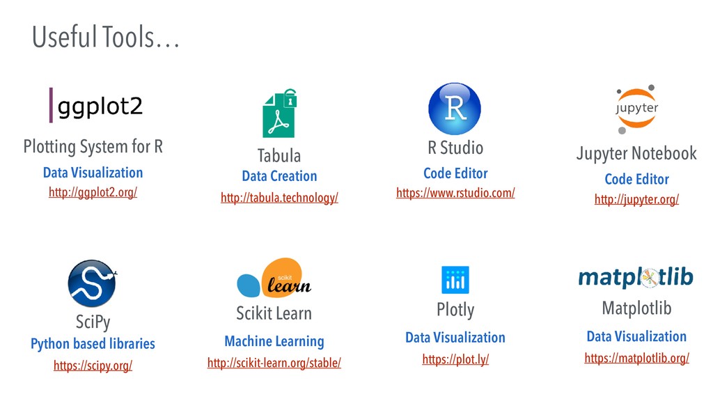Scikit Learn http://scikit-learn.org/stable/ Machine Learning SciPy https://scipy.org/ Python based libraries Jupyter Notebook http://jupyter.org/ Code Editor Tabula http://tabula.technology/ Data Creation Plotting System for R Data Visualization http://ggplot2.org/ R Studio https://www.rstudio.com/ Code Editor