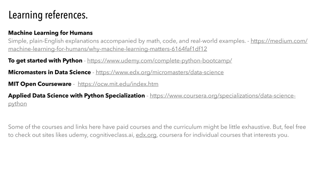 by math, code, and real-world examples. - https://medium.com/ machine-learning-for-humans/why-machine-learning-matters-6164faf1df12 To get started with Python - https://www.udemy.com/complete-python-bootcamp/ Micromasters in Data Science - https://www.edx.org/micromasters/data-science MIT Open Courseware - https://ocw.mit.edu/index.htm Applied Data Science with Python Specialization - https://www.coursera.org/specializations/data-science- python Some of the courses and links here have paid courses and the curriculum might be little exhaustive. But, feel free to check out sites likes udemy, cognitiveclass.ai, edx.org, coursera for individual courses that interests you.