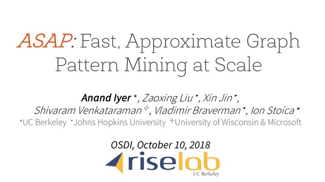 (0,1), (0,2), (0,3), (0,4), (1,2), (1,3), (1,4), (2,3), (2,4), (3,4) ditionalSampleEdge: (subgraph)!(e, p) Uniformly sample an edge that is adjacent to the give subgraph and comes after the subgraph in the order. ditionalClose: (subgraph, subgraph)!boolean Given a sampled subgraph, check if another subgrap that appears later in the order can be formed. Table 1: ASAP’s Approximate Pattern Mining API. leThreeNodeChain p1) = SampleEdge() p2) = ConditionalSampleEdge(Subgraph(e1)) e2) rn 0 rn 1/(p1.p2) SampleTriangle 1 (e1, p1) = sampleEdge() 2 (e2, p2) = conditionalSampleEdge(Subgraph(e1)) 3 if (!e2) return 0 4 subgraph1 = Subgraph(e1, e2) 5 subgraph2 = Triangle(e1, e2)-subgraph1 6 if conditionalClose(subgraph1, subgraph2) 7 return 1/(p1.p2) 8 else return 0 leFourCliqueType1 p1) = SampleEdge() p2) = ConditionalSampleEdge(Subgraph(e1)) e2) return 0 p3) = ConditionalSampleEdge(Subgraph(e1, e2)) e3) return 0 SampleFourCliqueType2 1 (e1, p1) = SampleEdge() 2 (e2, p2) = SampleEdge() 3 if (isAdjacent(e1, e2) == true) 4 return 0 5 subgraph1 = Subgraph(e1, e2) 0 3 4 See paper for more examples & proof Sampling phase fixes the vertices for a particular instance of a pattern and closing phase waits for remaining edges ASAP computes the right expectations, runs many instances of the estimator and aggregates results !" = 40