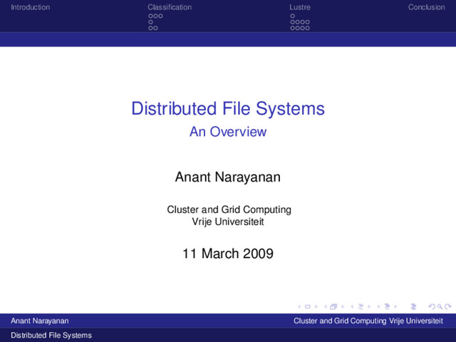 fault tolerant, object based file system Tens of thousands of nodes Petabytes of storage capacity Hundreds of Gigabytes / second of throughput Without compromising on speed or security Small workgroup clusters, to large-scale, multi-site clusters, to super-computers Anant Narayanan Cluster and Grid Computing Vrije Universiteit Distributed File Systems