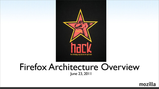 all the pieces • Stable, supported bindings for C++ and JavaScript • Interfaces defined in dialect of IDL called XPIDL • Any part of the code can create & use XPCOM objects • Core provides objects to deal with: Files, Memory, Threads, Data structures, Networking, etc.