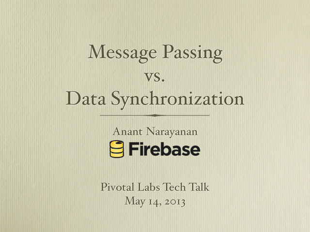 A Pivotal tech talk covering the advantages and disadvantages of using a message passing approach vs. data synchronization for building modern, distributed web applications.