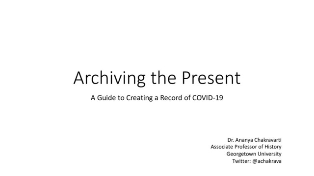 has changed. • Over half of the world’s population is online. Any archive of the present has to include born-digital materials. • The digital archives of the future are the databases of the present. • Companies routinely profit off the data we generate without compensating us and states around the world, often with the collusion of such companies (e.g. Facebook) use this data for purposes of surveillance. • When we amass digital records, even for the purposes of archiving, we must be aware that they are databases vulnerable to both sorts of exploitation. Consider anonymizing sources to protect information if necessary. • Still, democratizing access to reliable information is important both for the future and now when misinformation, often deliberately spread for political gain or private profit, can exacerbate a pandemic with catastrophic consequences.
