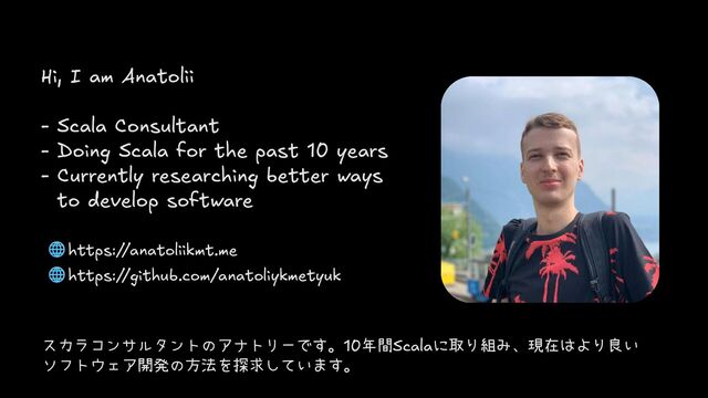 for the past 10 years - Currently researching better ways to develop software スカラコンサルタントのアナトリーです。10年間Scalaに取り組み、現在はより良い ソフトウェア開発の方法を探求しています。 🌐https:/ /anatoliikmt.me 🌐https:/ /github.com/anatoliykmetyuk