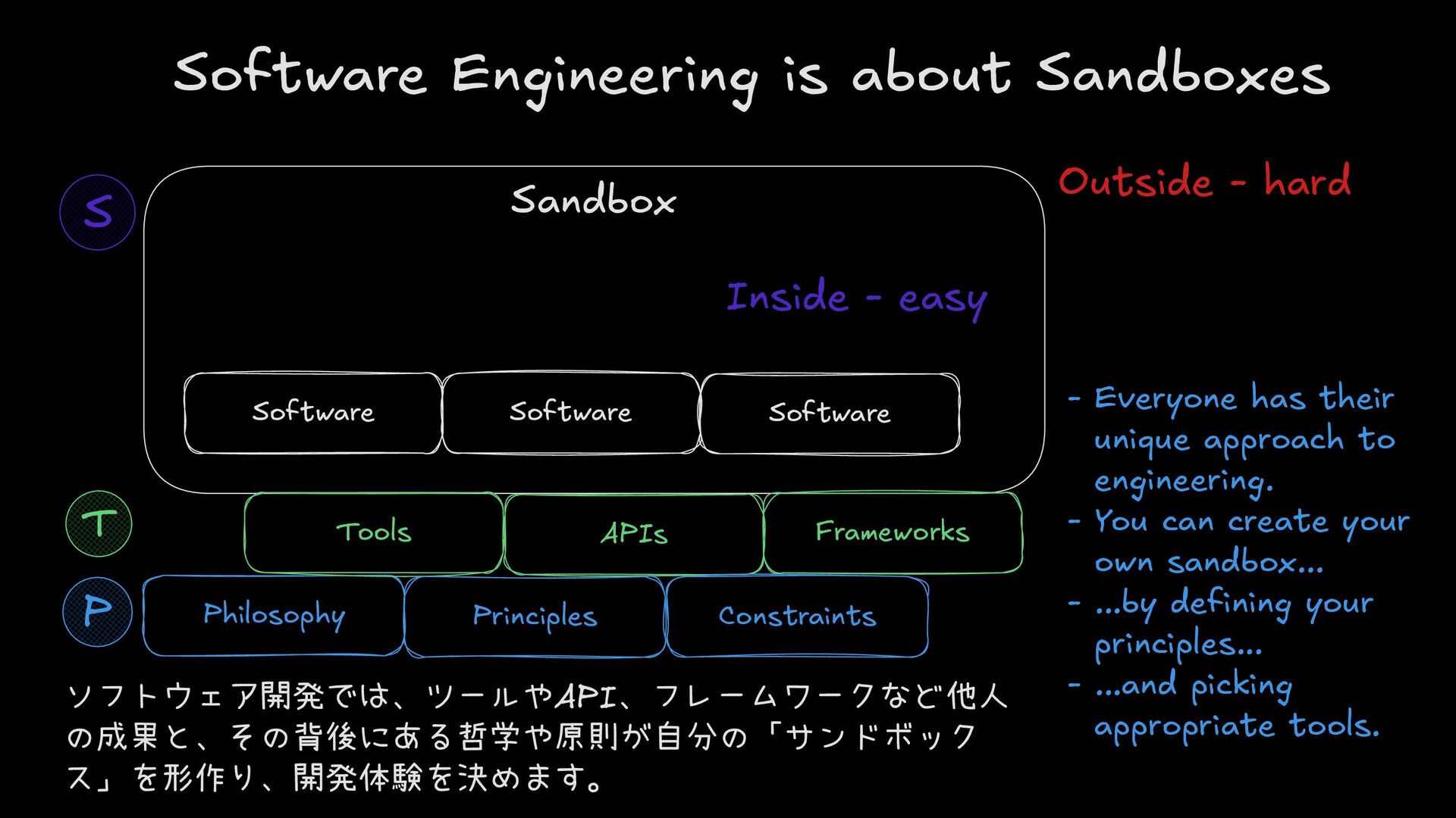 Software Engineering is about Sandboxes Inside - easy Outside - hard - Everyone has their unique approach to engineering. - You can create your own sandbox... - ...by defining your principles... - ...and picking appropriate tools. ソフトウェア開発では、ツールやAPI、フレームワークなど他人 の成果と、その背後にある哲学や原則が自分の「サンドボック ス」を形作り、開発体験を決めます。 P T S