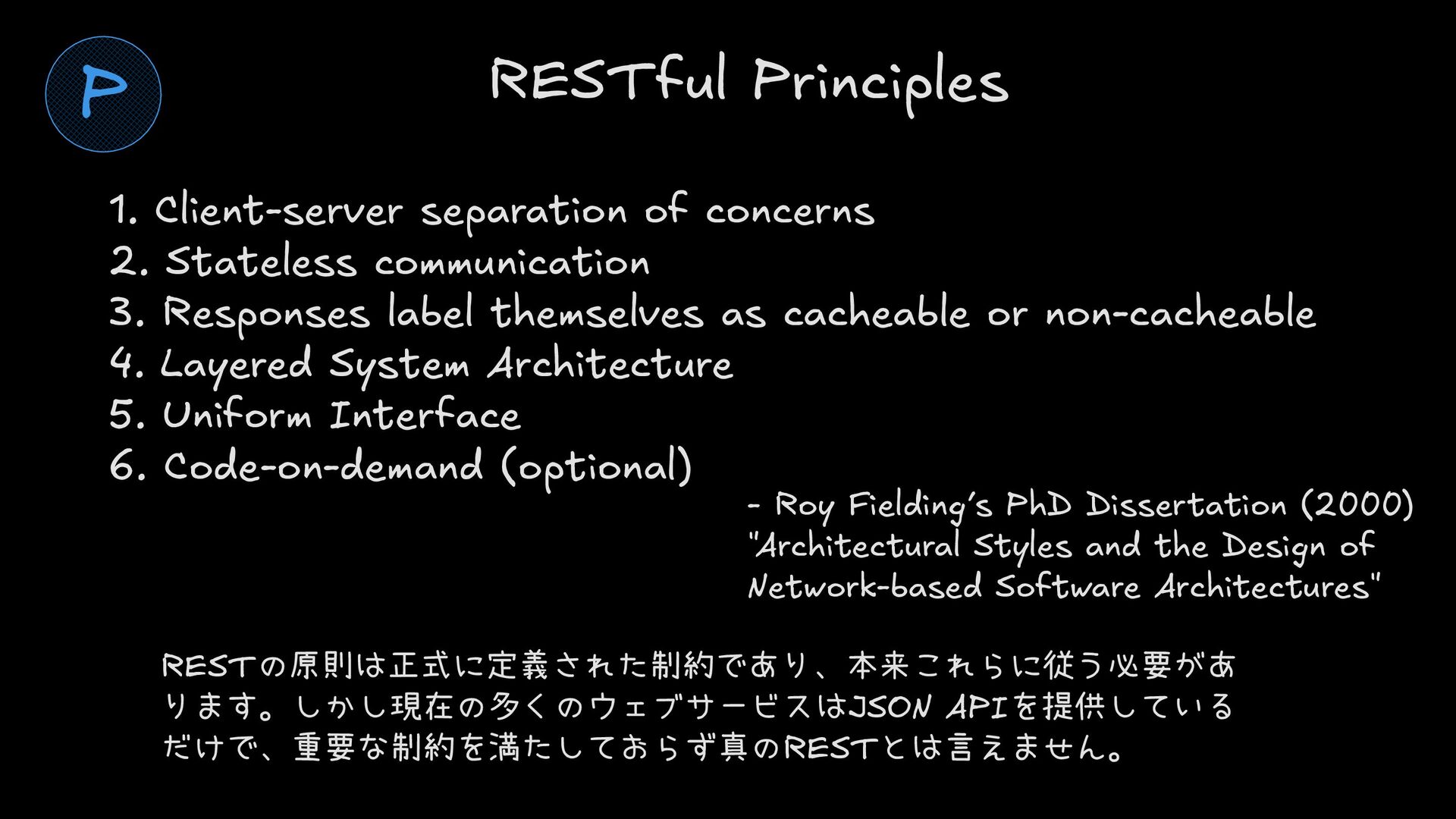 3. Responses label themselves as cacheable or non-cacheable 4. Layered System Architecture 5. Uniform Interface 6. Code-on-demand (optional) RESTの原則は正式に定義された制約であり、本来これらに従う必要があ ります。しかし現在の多くのウェブサービスはJSON APIを提供している だけで、重要な制約を満たしておらず真のRESTとは言えません。 - Roy Fielding’s PhD Dissertation (2000) "Architectural Styles and the Design of Network-based Software Architectures" P