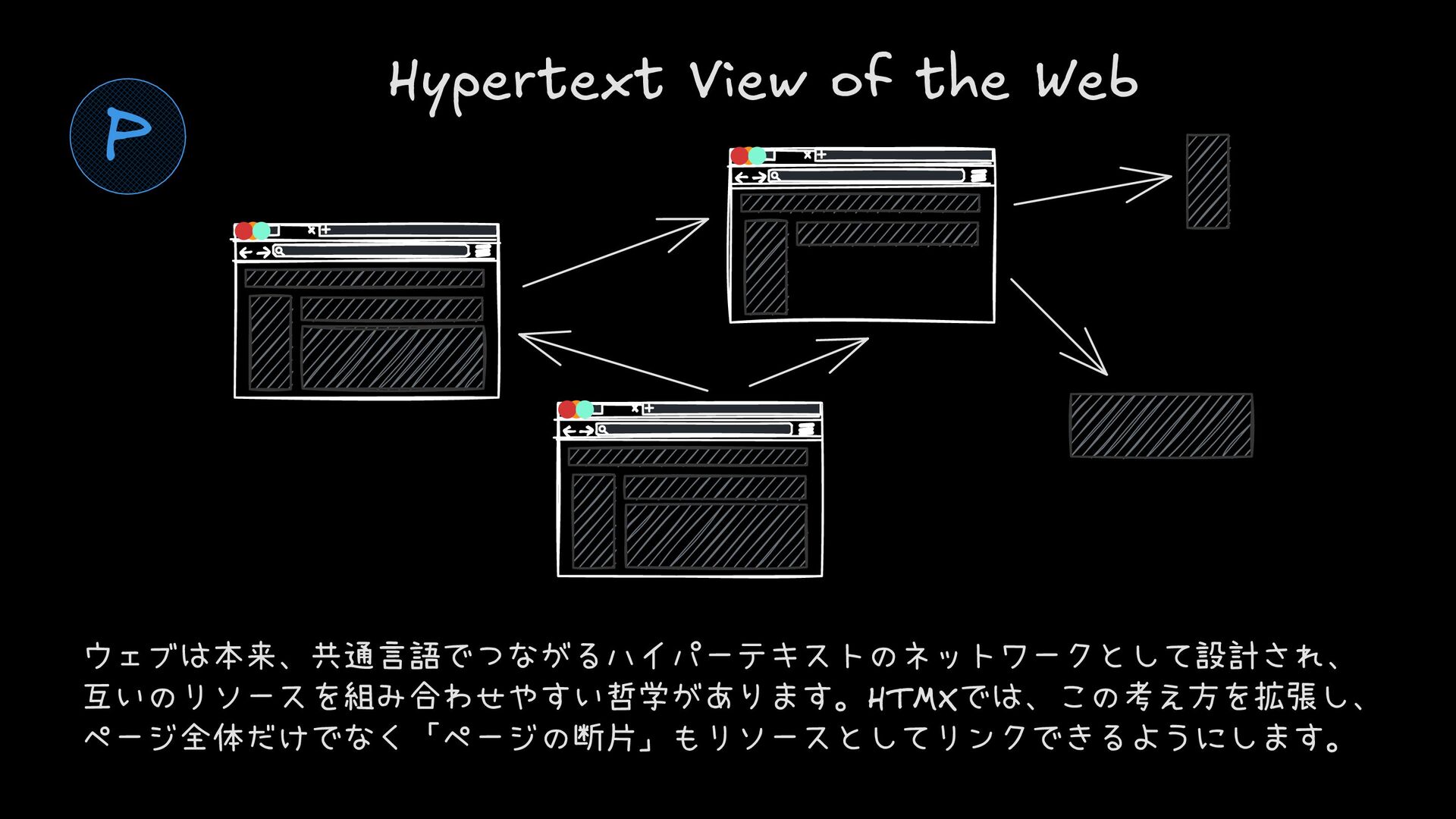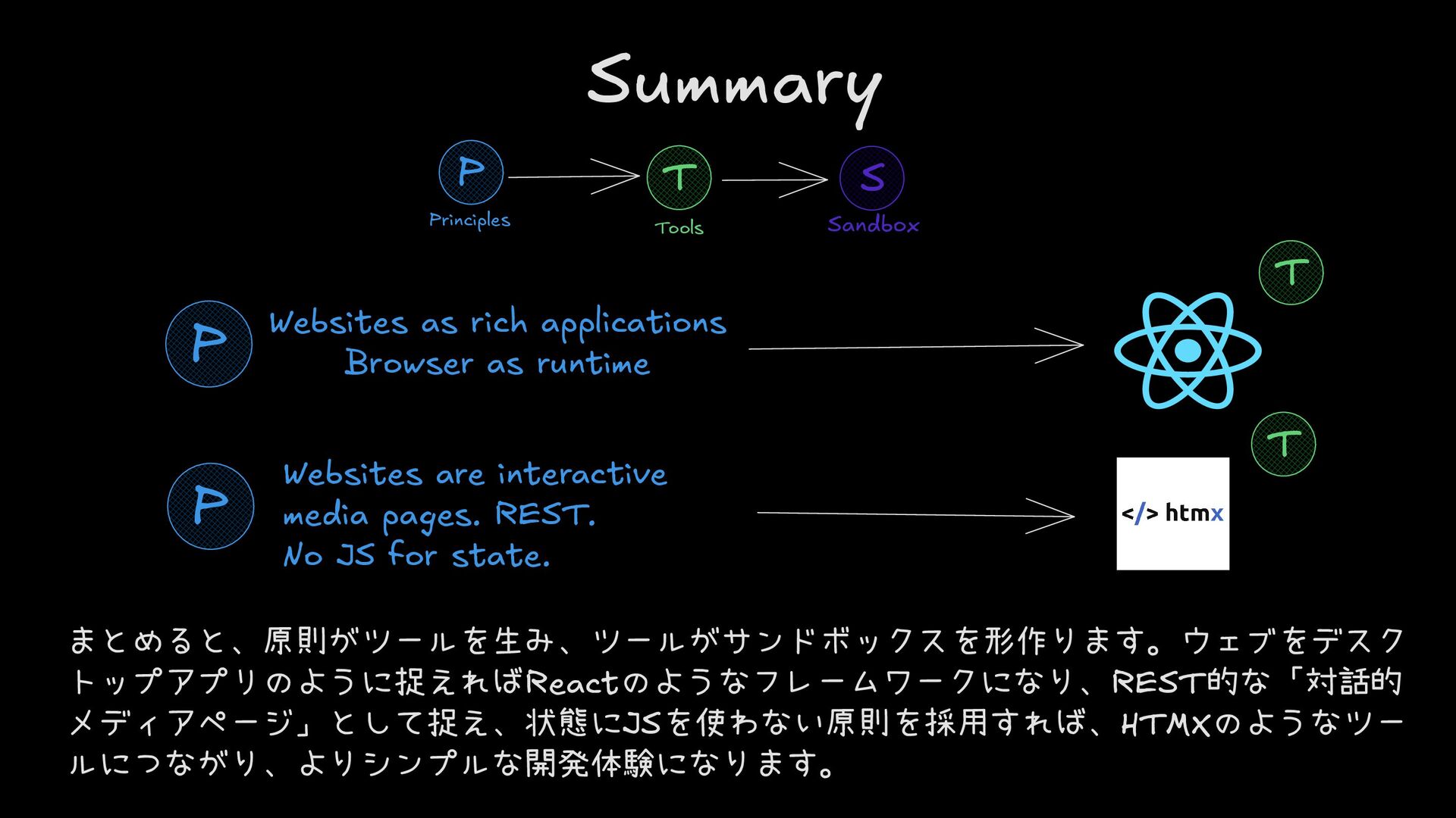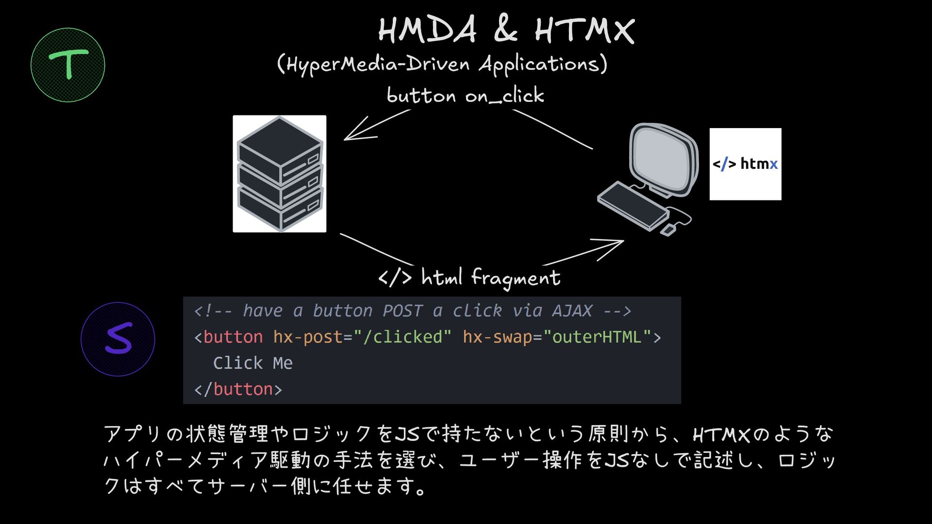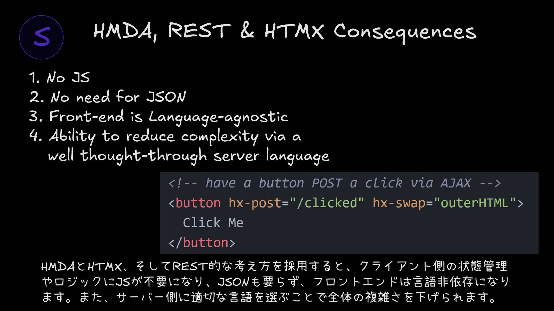 need for JSON 3. Front-end is Language-agnostic 4. Ability to reduce complexity via a well thought-through server language HMDAとHTMX、そしてREST的な考え方を採用すると、クライアント側の状態管理 やロジックにJSが不要になり、JSONも要らず、フロントエンドは言語非依存になり ます。また、サーバー側に適切な言語を選ぶことで全体の複雑さを下げられます。 S