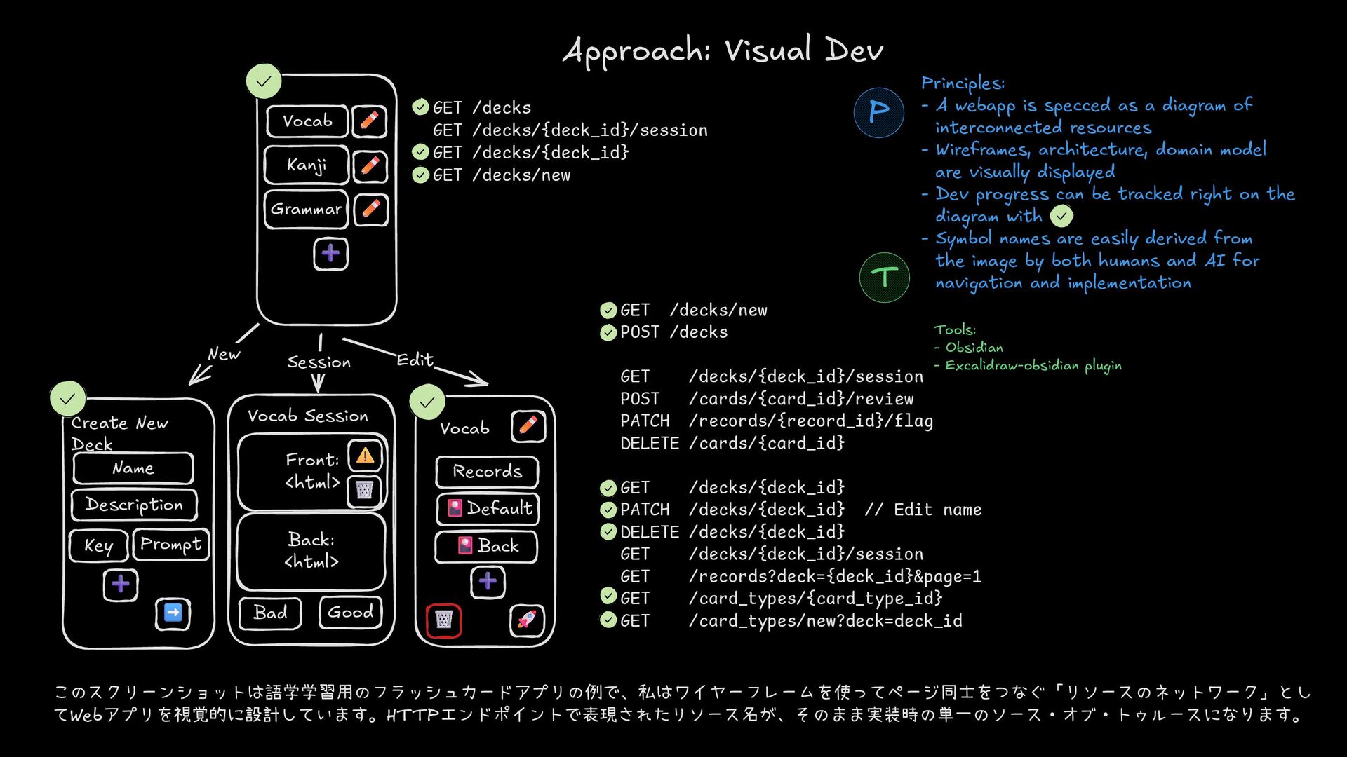 a diagram of interconnected resources - Wireframes, architecture, domain model are visually displayed - Dev progress can be tracked right on the diagram with - Symbol names are easily derived from the image by both humans and AI for navigation and implementation Tools: - Obsidian - Excalidraw-obsidian plugin このスクリーンショットは語学学習用のフラッシュカードアプリの例で、私はワイヤーフレームを使ってページ同士をつなぐ「リソースのネットワーク」とし てWebアプリを視覚的に設計しています。HTTPエンドポイントで表現されたリソース名が、そのまま実装時の単一のソース・オブ・トゥルースになります。 Vocab Kanji Grammar Front: <html> Back: <html> Good Bad ✏️ ✏️ ✏️ Session ➕ Edit Records Vocab ✏️ 🗑️ Create New Deck New ➕ Key Prompt 🎴Default 🎴Back ➕ ➡️ Name Description 🚀 ⚠️ 🗑️ Vocab Session GET /decks GET /decks/{deck_id}/session GET /decks/{deck_id} GET /decks/new GET /decks/new POST /decks GET /decks/{deck_id}/session POST /cards/{card_id}/review PATCH /records/{record_id}/flag DELETE /cards/{card_id} GET /decks/{deck_id} PATCH /decks/{deck_id} // Edit name DELETE /decks/{deck_id} GET /decks/{deck_id}/session GET /records?deck={deck_id}&page=1 GET /card_types/{card_type_id} GET /card_types/new?deck=deck_id P T