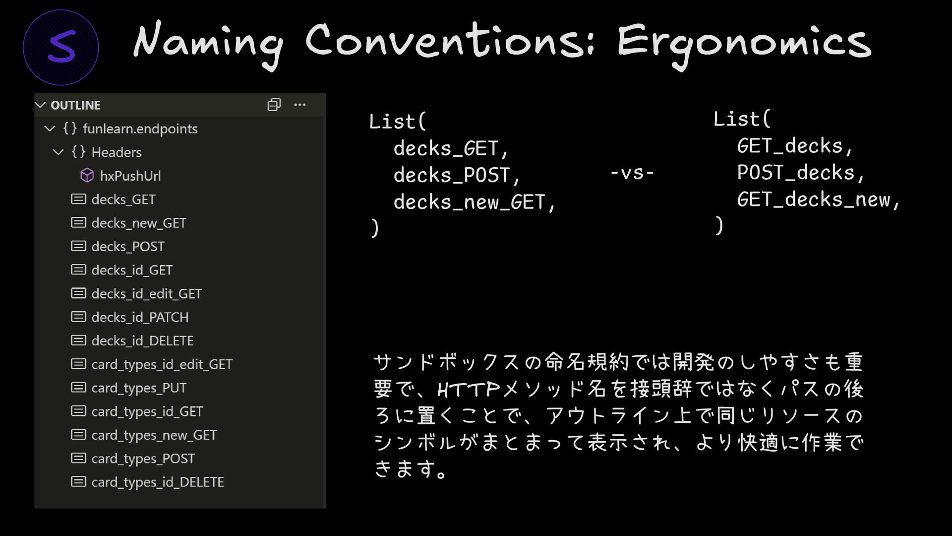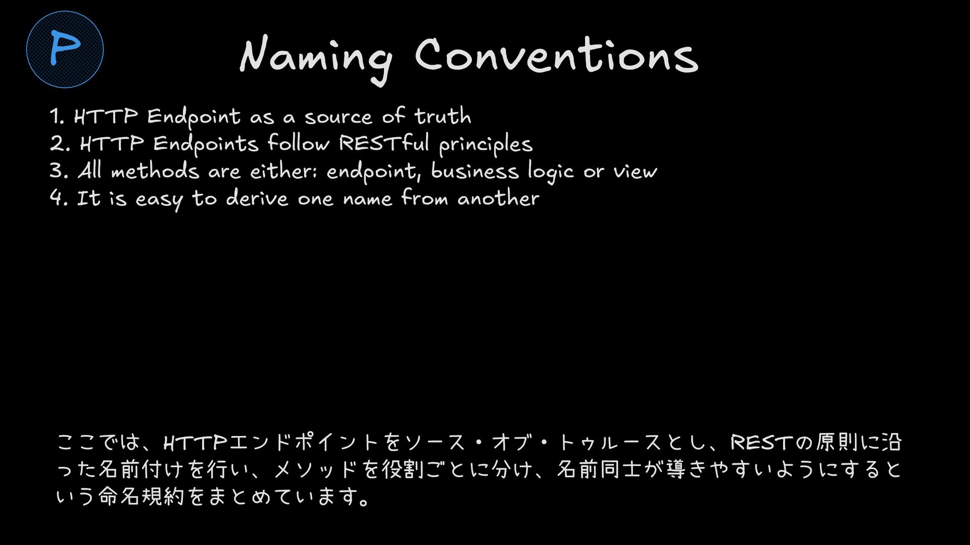 2. HTTP Endpoints follow RESTful principles 3. All methods are either: endpoint, business logic or view 4. It is easy to derive one name from another ここでは、HTTPエンドポイントをソース・オブ・トゥルースとし、RESTの原則に沿 った名前付けを行い、メソッドを役割ごとに分け、名前同士が導きやすいようにすると いう命名規約をまとめています。 P