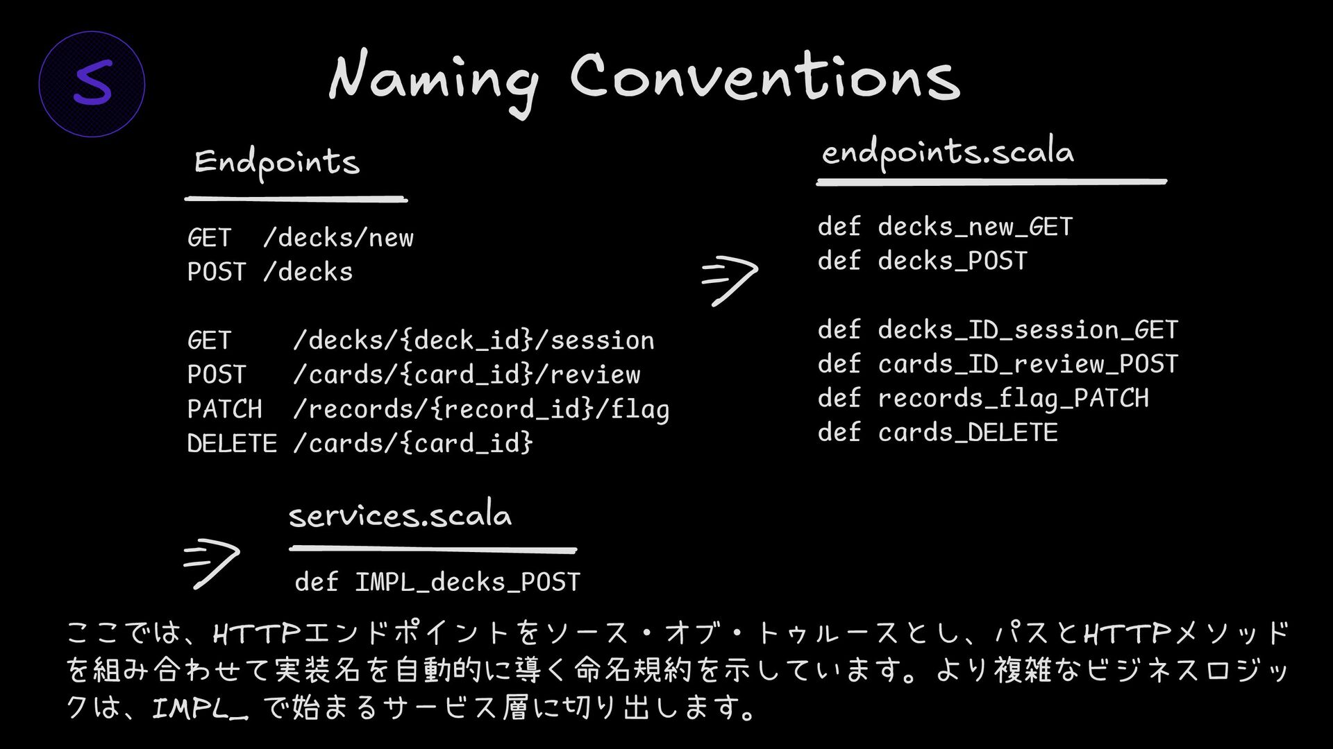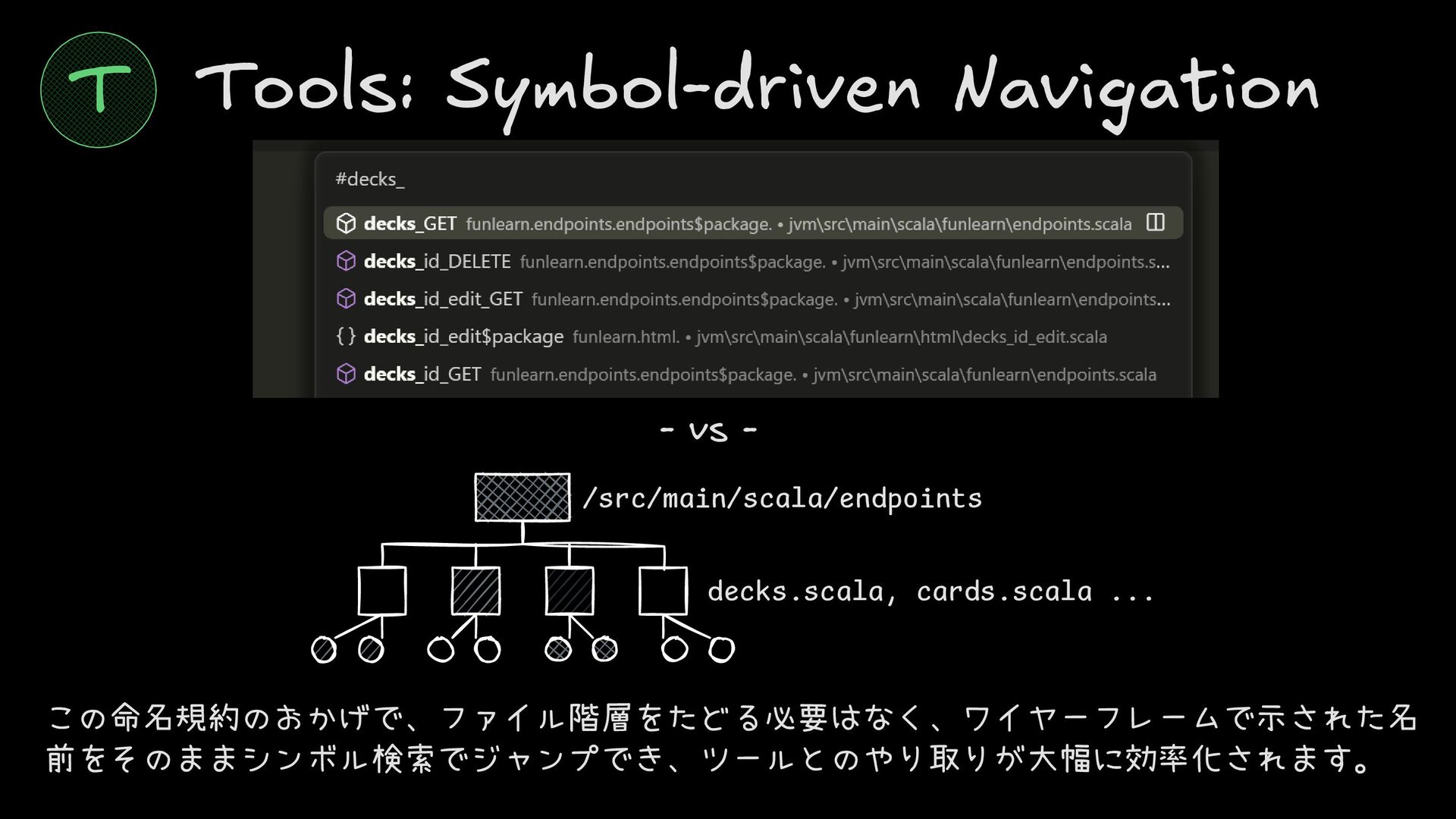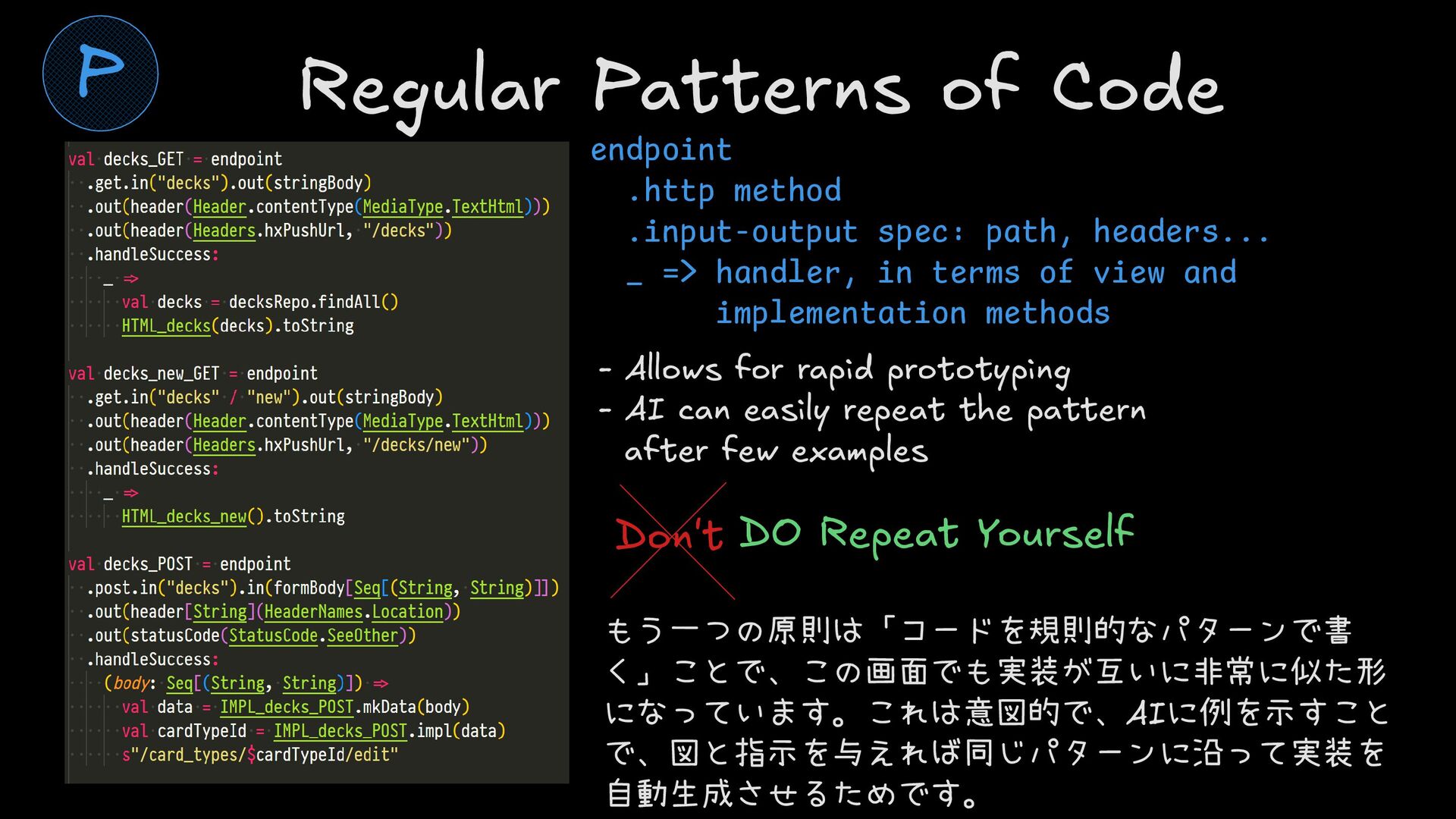 headers... _ => handler, in terms of view and implementation methods - Allows for rapid prototyping - AI can easily repeat the pattern after few examples DO Repeat Yourself Don't もう一つの原則は「コードを規則的なパターンで書 く」ことで、この画面でも実装が互いに非常に似た形 になっています。これは意図的で、AIに例を示すこと で、図と指示を与えれば同じパターンに沿って実装を 自動生成させるためです。 P
