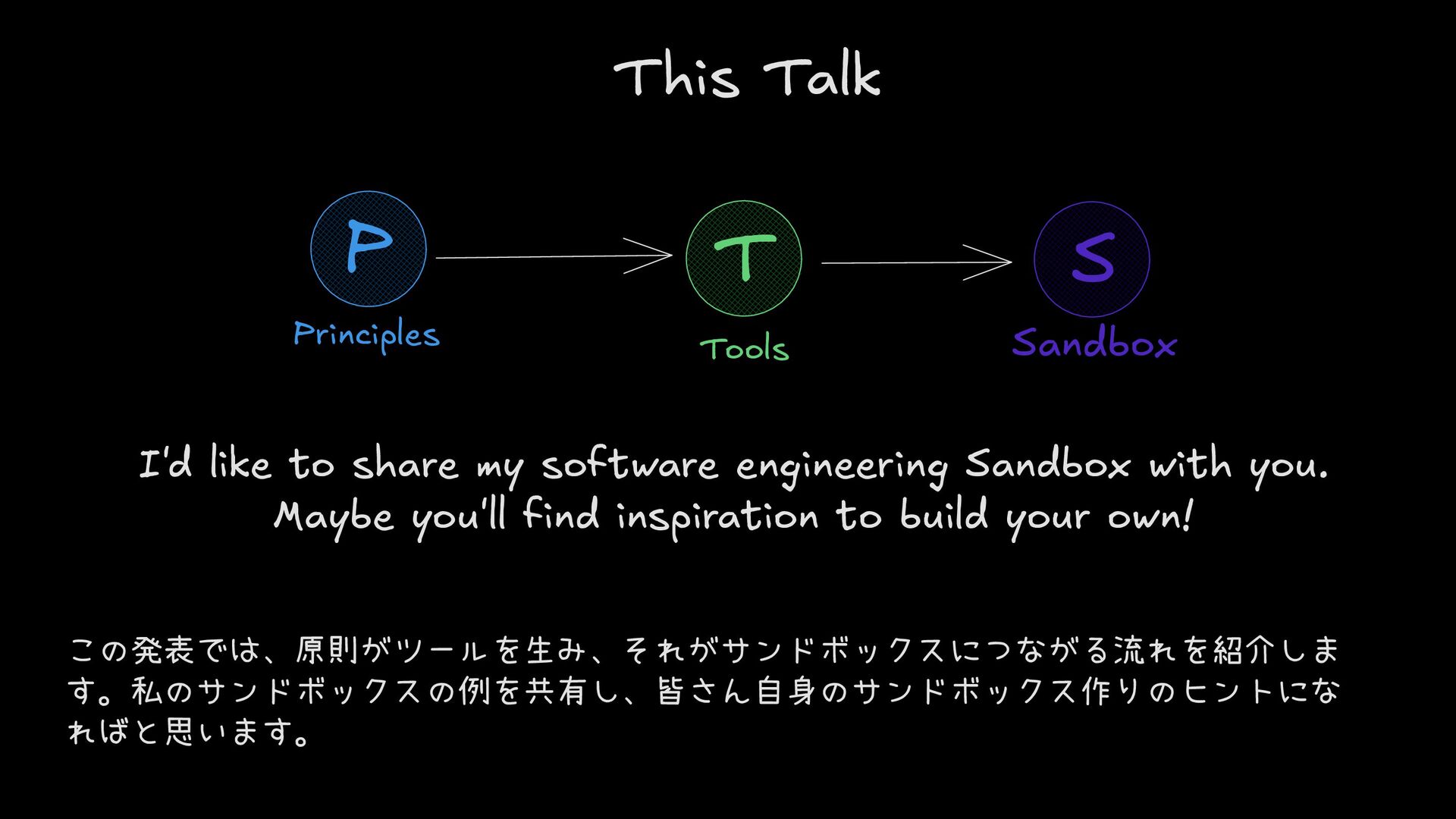 with you. Maybe you'll find inspiration to build your own! Principles Sandbox この発表では、原則がツールを生み、それがサンドボックスにつながる流れを紹介しま す。私のサンドボックスの例を共有し、皆さん自身のサンドボックス作りのヒントにな ればと思います。 P T S Tools