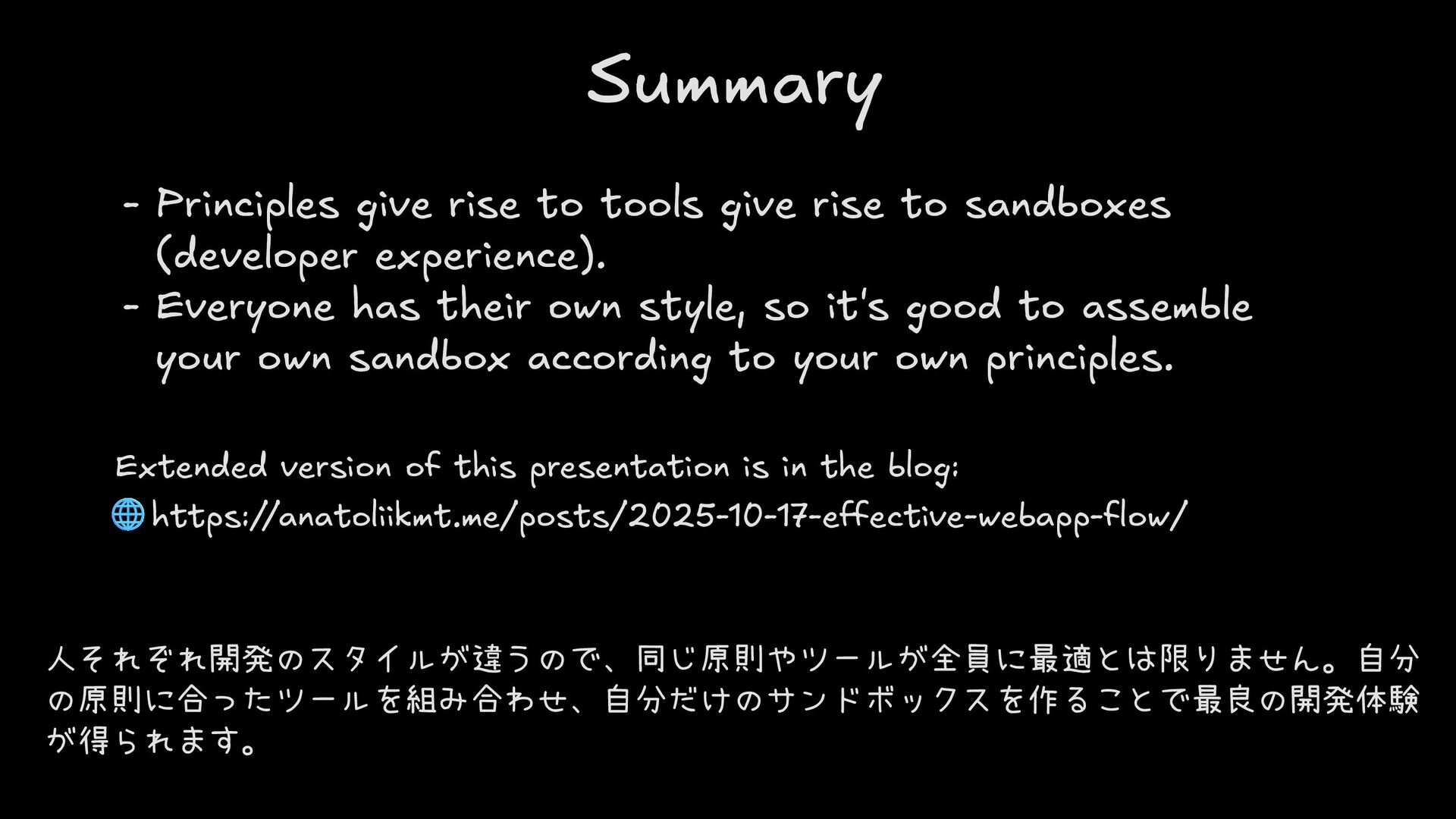 sandboxes (developer experience). - Everyone has their own style, so it's good to assemble your own sandbox according to your own principles. 人それぞれ開発のスタイルが違うので、同じ原則やツールが全員に最適とは限りません。自分 の原則に合ったツールを組み合わせ、自分だけのサンドボックスを作ることで最良の開発体験 が得られます。 🌐https:/ /anatoliikmt.me/posts/2025-10-17-effective-webapp-flow/ Extended version of this presentation is in the blog: