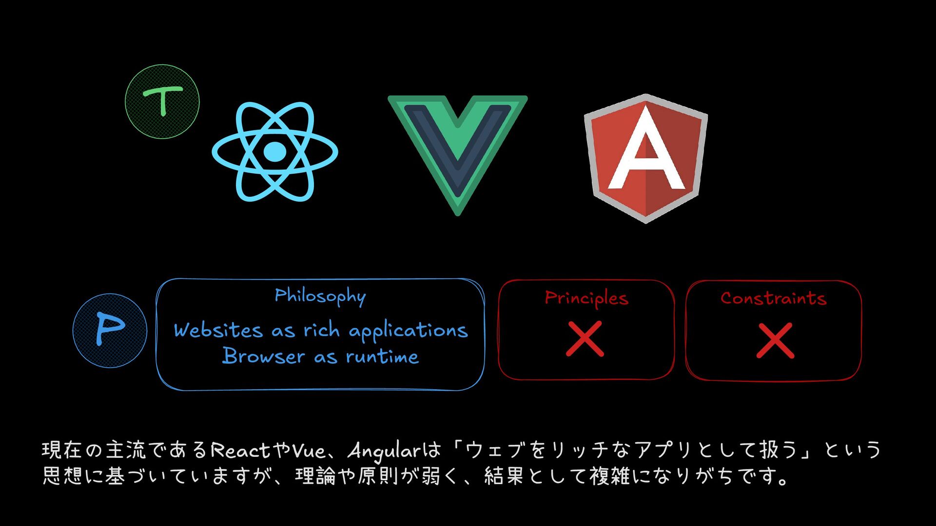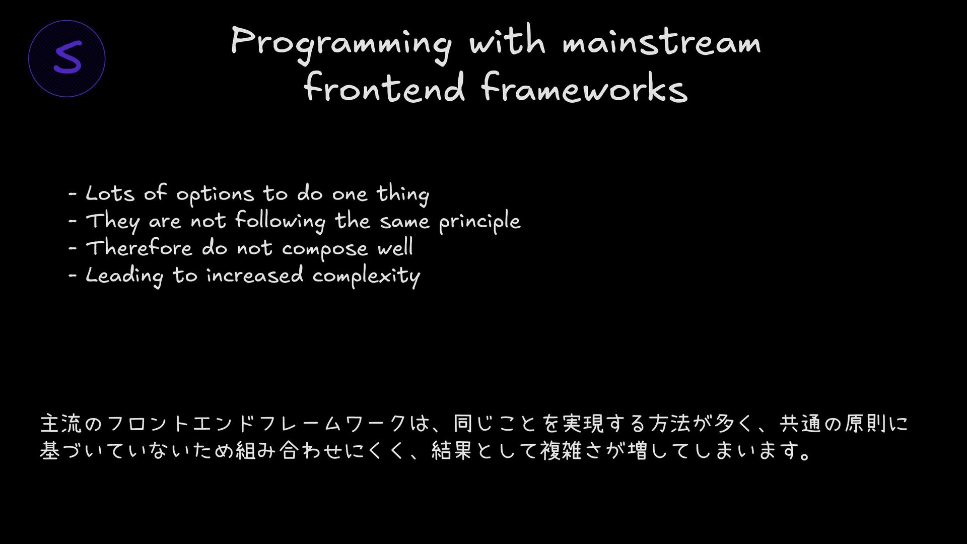 do one thing - They are not following the same principle - Therefore do not compose well - Leading to increased complexity 主流のフロントエンドフレームワークは、同じことを実現する方法が多く、共通の原則に 基づいていないため組み合わせにくく、結果として複雑さが増してしまいます。 S