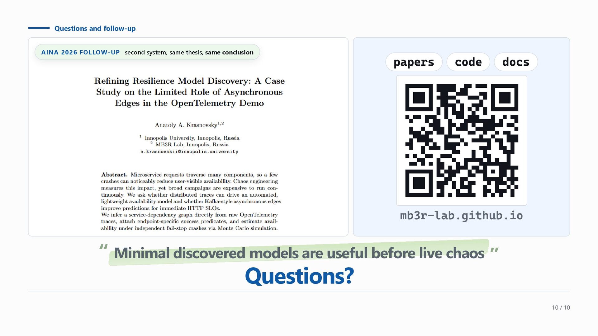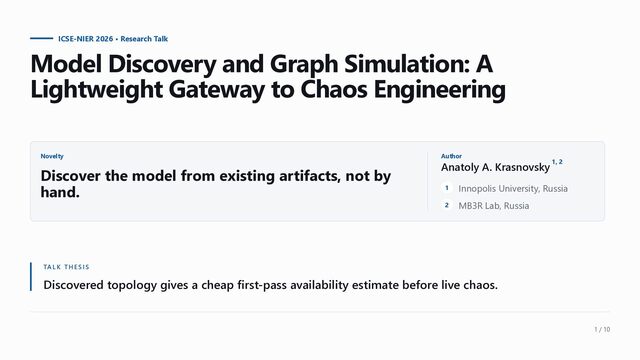 Author Anatoly A. Krasnovsky 1 Innopolis University, Russia 2 MB3R Lab, Russia TA L K T H E S I S Discovered topology gives a cheap first-pass availability estimate before live chaos. 1 / 10 ICSE-NIER 2026 • Research Talk Model Discovery and Graph Simulation: A Lightweight Gateway to Chaos Engineering 1, 2