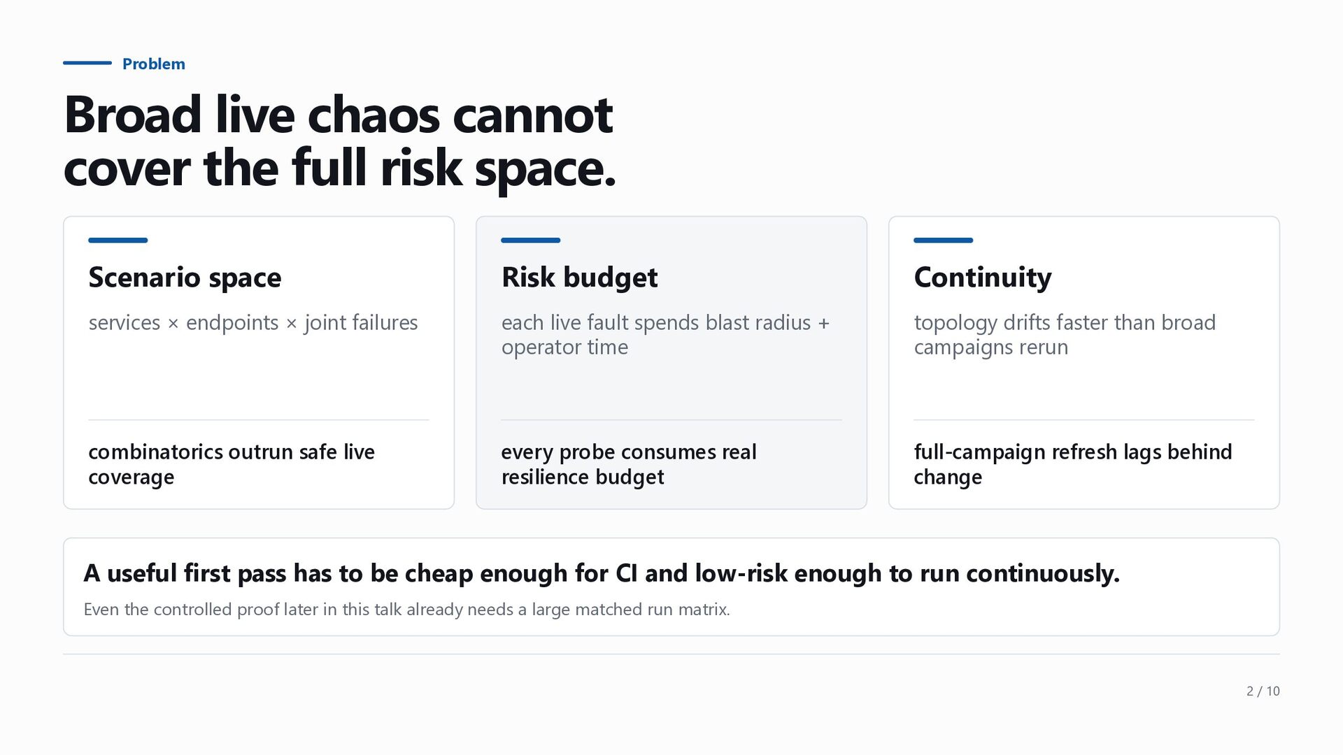 safe live coverage Risk budget each live fault spends blast radius + operator time every probe consumes real resilience budget Continuity topology drifts faster than broad campaigns rerun full-campaign refresh lags behind change A useful first pass has to be cheap enough for CI and low-risk enough to run continuously. Even the controlled proof later in this talk already needs a large matched run matrix. 2 / 10 Problem Broad live chaos cannot cover the full risk space.