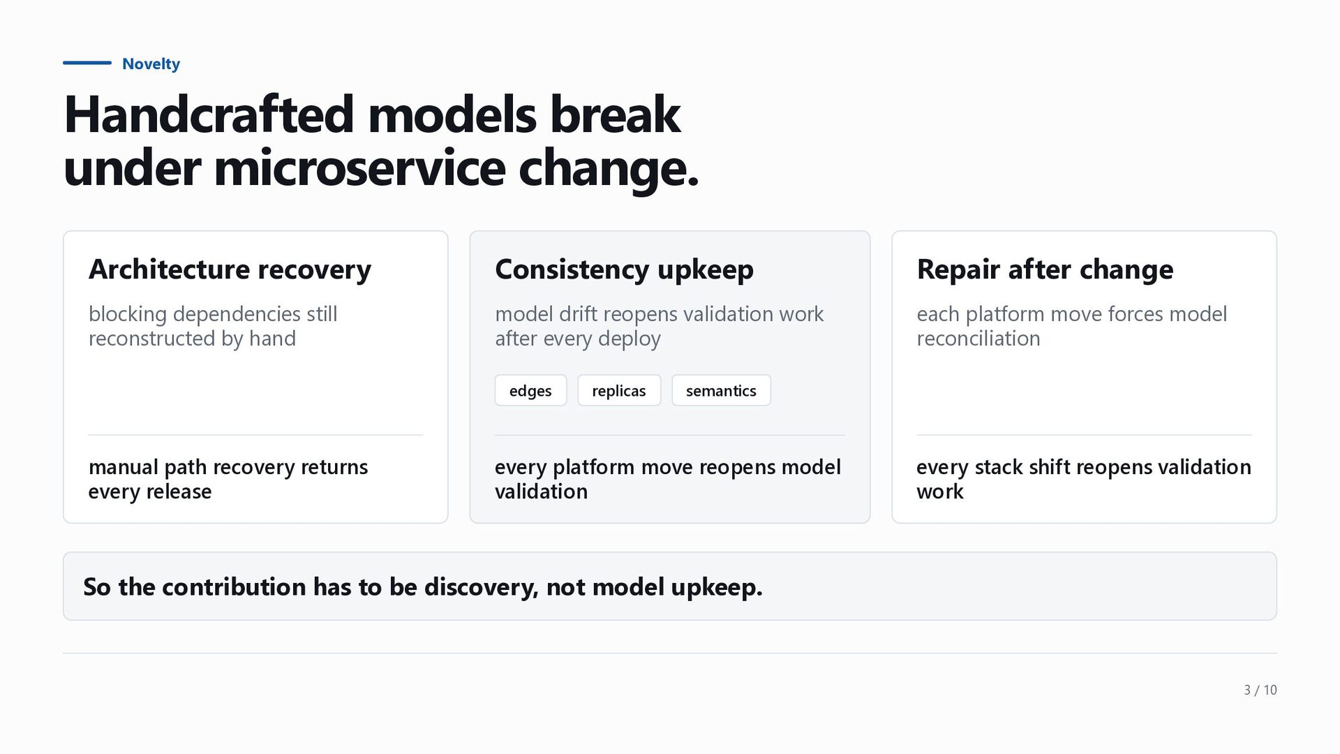 recovery returns every release Consistency upkeep model drift reopens validation work after every deploy edges replicas semantics every platform move reopens model validation Repair after change each platform move forces model reconciliation every stack shift reopens validation work So the contribution has to be discovery, not model upkeep. 3 / 10 Novelty Handcrafted models break under microservice change.