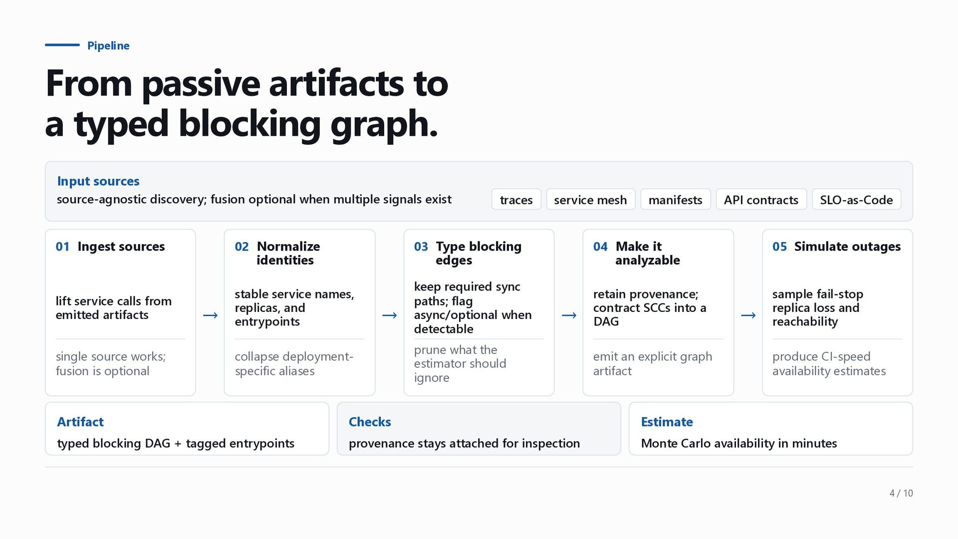 traces service mesh manifests API contracts SLO-as-Code 01 Ingest sources lift service calls from emitted artifacts single source works; fusion is optional → 02 Normalize identities stable service names, replicas, and entrypoints collapse deployment- specific aliases → 03 Type blocking edges keep required sync paths; flag async/optional when detectable prune what the estimator should ignore → 04 Make it analyzable retain provenance; contract SCCs into a DAG emit an explicit graph artifact → 05 Simulate outages sample fail-stop replica loss and reachability produce CI-speed availability estimates Artifact typed blocking DAG + tagged entrypoints Checks provenance stays attached for inspection Estimate Monte Carlo availability in minutes 4 / 10 Pipeline From passive artifacts to a typed blocking graph.