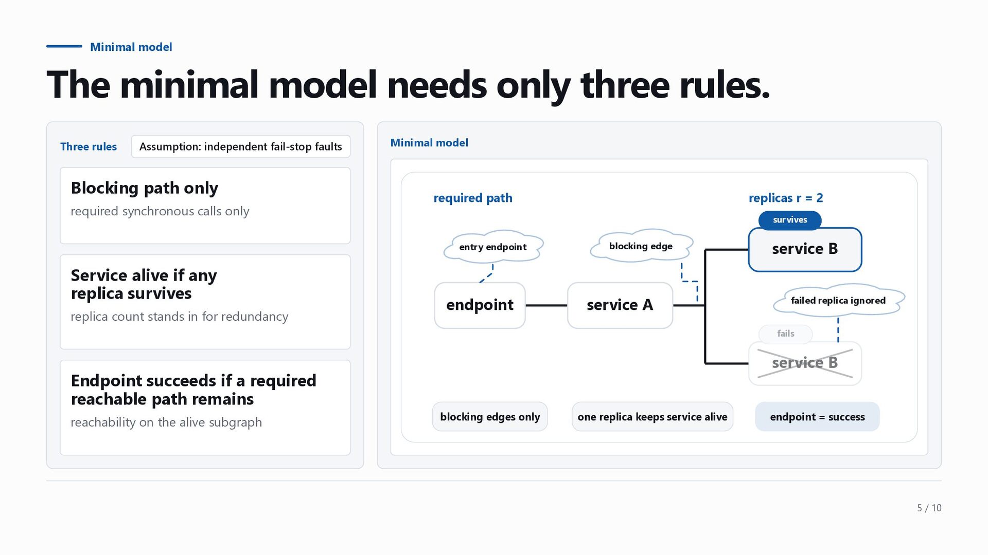 synchronous calls only Service alive if any replica survives replica count stands in for redundancy Endpoint succeeds if a required reachable path remains reachability on the alive subgraph Minimal model required path replicas r = 2 endpoint service A service B survives service B fails entry endpoint blocking edge failed replica ignored blocking edges only one replica keeps service alive endpoint = success 5 / 10 Minimal model The minimal model needs only three rules.