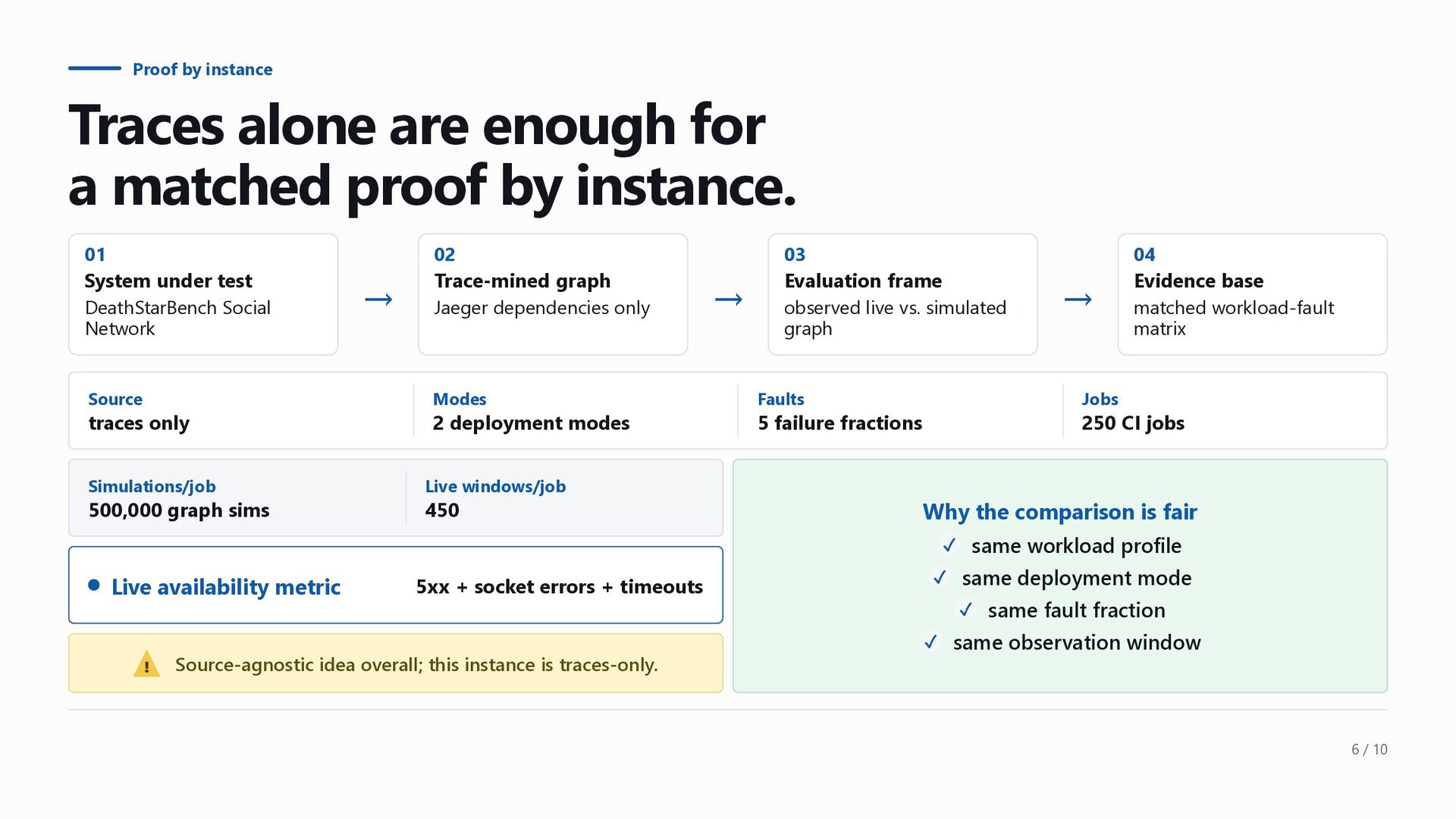for a matched proof by instance. 01 System under test DeathStarBench Social Network → 02 Trace-mined graph Jaeger dependencies only → 03 Evaluation frame observed live vs. simulated graph → 04 Evidence base matched workload-fault matrix Source traces only Modes 2 deployment modes Faults 5 failure fractions Jobs 250 CI jobs Simulations/job 500,000 graph sims Live windows/job 450 Why the comparison is fair ✓ same workload profile ✓ same deployment mode ✓ same fault fraction ✓ same observation window Live availability metric 5xx + socket errors + timeouts Source-agnostic idea overall; this instance is traces-only. !