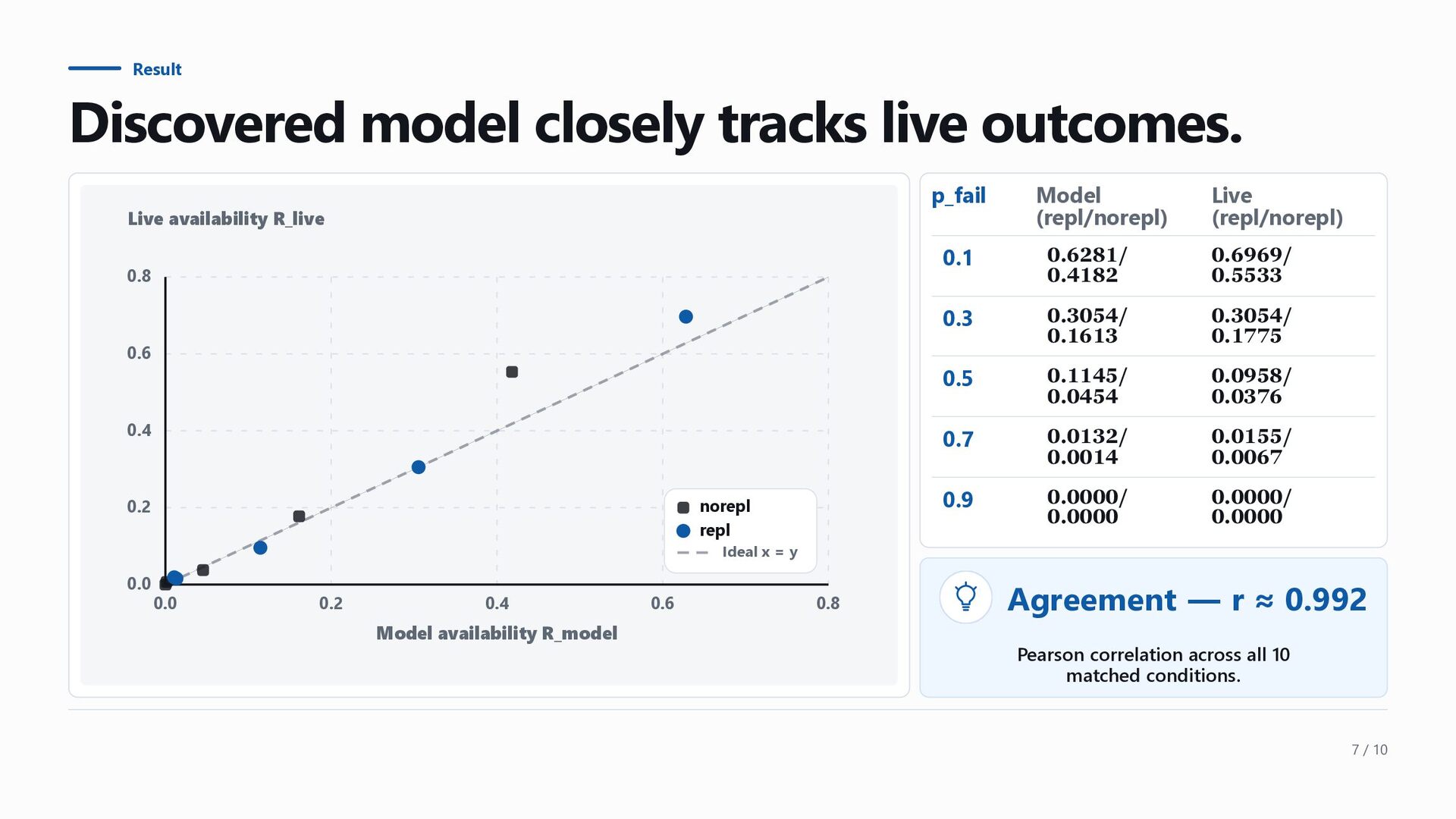 0.6 0.8 0.8 Model availability R_model norepl repl Ideal x = y p_fail Model (repl/norepl) Live (repl/norepl) 0.1 0.6281/ 0.4182 0.6969/ 0.5533 0.3 0.3054/ 0.1613 0.3054/ 0.1775 0.5 0.1145/ 0.0454 0.0958/ 0.0376 0.7 0.0132/ 0.0014 0.0155/ 0.0067 0.9 0.0000/ 0.0000 0.0000/ 0.0000 Agreement — r ≈ 0.992 Pearson correlation across all 10 matched conditions. 7 / 10 Result Discovered model closely tracks live outcomes.