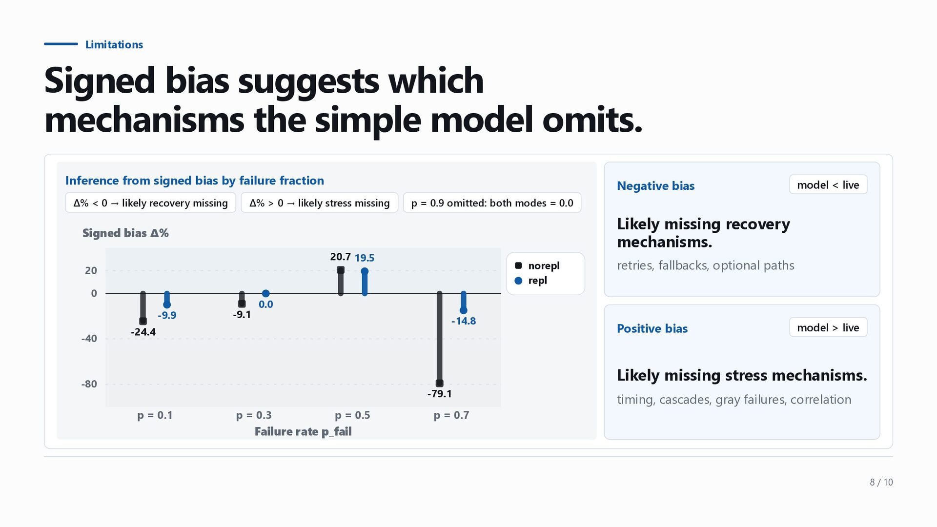simple model omits. Inference from signed bias by failure fraction Δ% < 0 → likely recovery missing Δ% > 0 → likely stress missing p = 0.9 omitted: both modes = 0.0 Signed bias Δ% -80 -40 0 20 p = 0.1 p = 0.3 p = 0.5 p = 0.7 Failure rate p_fail -24.4 -9.1 20.7 -79.1 -9.9 0.0 19.5 -14.8 norepl repl Negative bias model < live Likely missing recovery mechanisms. retries, fallbacks, optional paths Positive bias model > live Likely missing stress mechanisms. timing, cascades, gray failures, correlation