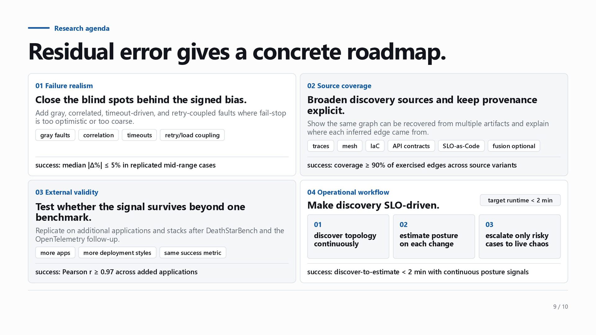 bias. Add gray, correlated, timeout-driven, and retry-coupled faults where fail-stop is too optimistic or too coarse. gray faults correlation timeouts retry/load coupling success: median |Δ%| ≤ 5% in replicated mid-range cases 02 Source coverage Broaden discovery sources and keep provenance explicit. Show the same graph can be recovered from multiple artifacts and explain where each inferred edge came from. traces mesh IaC API contracts SLO-as-Code fusion optional success: coverage ≥ 90% of exercised edges across source variants 03 External validity Test whether the signal survives beyond one benchmark. Replicate on additional applications and stacks after DeathStarBench and the OpenTelemetry follow-up. more apps more deployment styles same success metric success: Pearson r ≥ 0.97 across added applications 04 Operational workflow Make discovery SLO-driven. target runtime < 2 min 01 discover topology continuously 02 estimate posture on each change 03 escalate only risky cases to live chaos success: discover-to-estimate < 2 min with continuous posture signals 9 / 10 Research agenda Residual error gives a concrete roadmap.